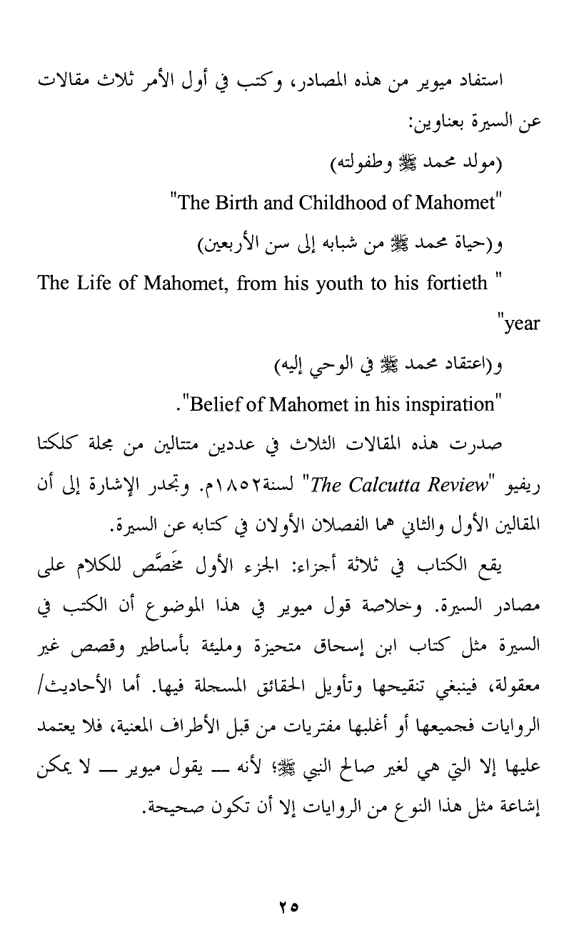 صدرت هذه المقالات الثلاث في عددين متتالين من مجلة كلكتا ريفيو "The Calcutta Review" لسنة1852م. وتجدر الإشارة إلى أن المقالين الأول والثاني هما الفصلان الأولان في كتابه عن السيرة.