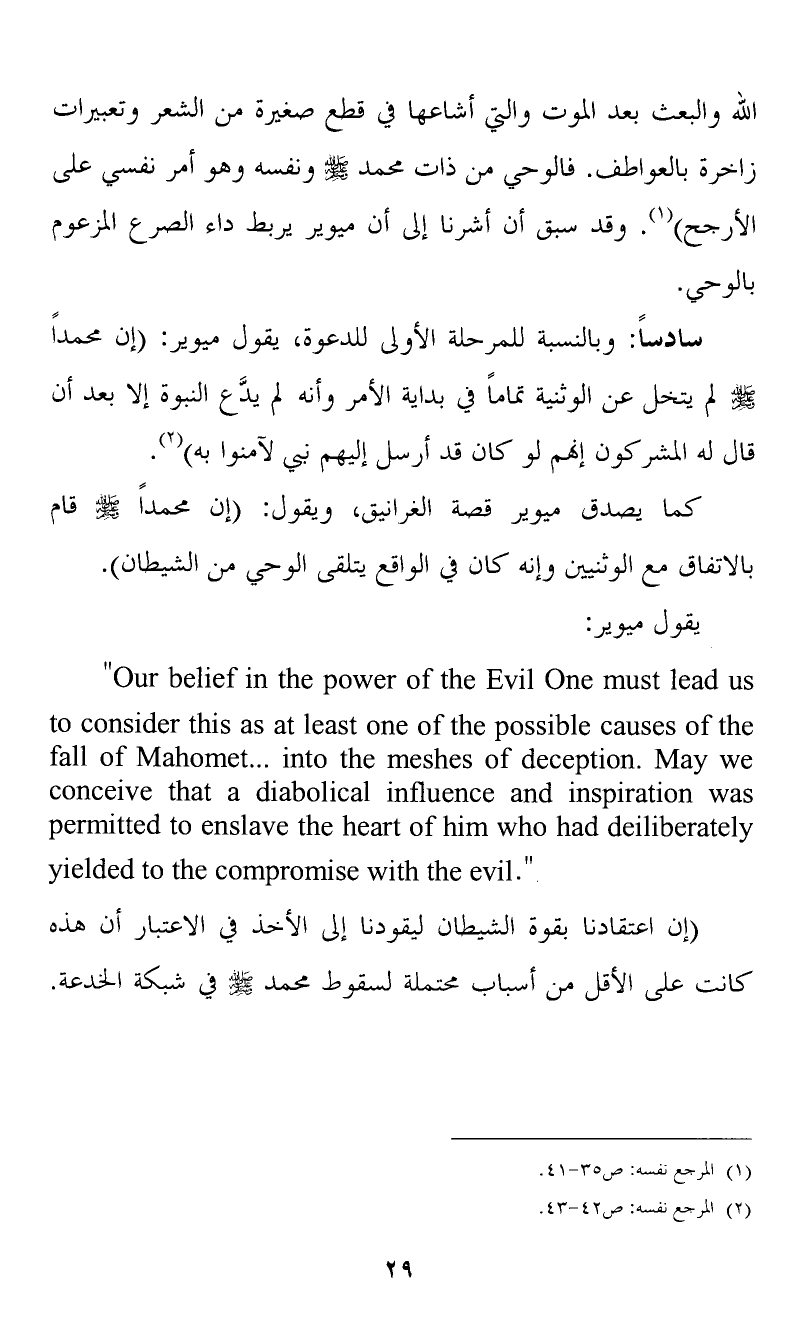 "Our belief in the power of the Evil One must lead us to consider this as at least one of the possible causes of the fall of Mahomet ... into the meshes of deception. May we conceive that a diabolical influence and inspiration was permitted to enslave the heart of him who had deiliberately yielded to the compromise with the evil".