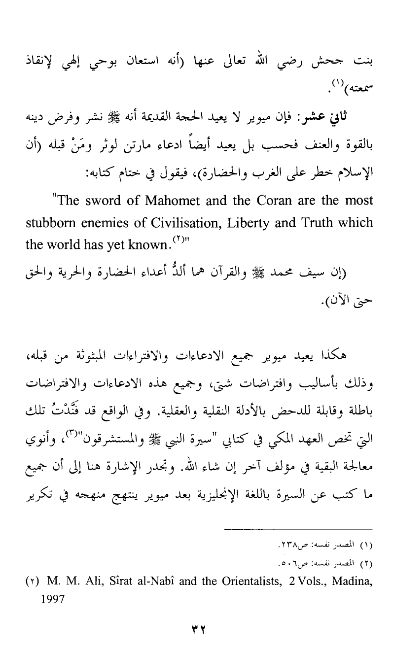 هكذا يعيد ميوير جميع الادعاءات والافتراءات المبثوثة من قبله، وذلك بأساليب وافتراضات شتى، وجميع هذه الادعاءات والافتراضات باطلة وقابلة للدحض بالأدلة النقلية والعقلية. وفي الواقع قد فَنَّدْتُ تلك التي تخص العهد المكي في كتابي "سيرة النبي صلى الله عليه وسلم والمستشرقون" (3) ، وأنوي معالجة البقية في مؤلف آخر إن شاء الله. وتجدر الإشارة هنا إلى أن جميع ما كتب عن السيرة باللغة الإنجليزية بعد ميوير ينتهج منهجه في تكرير