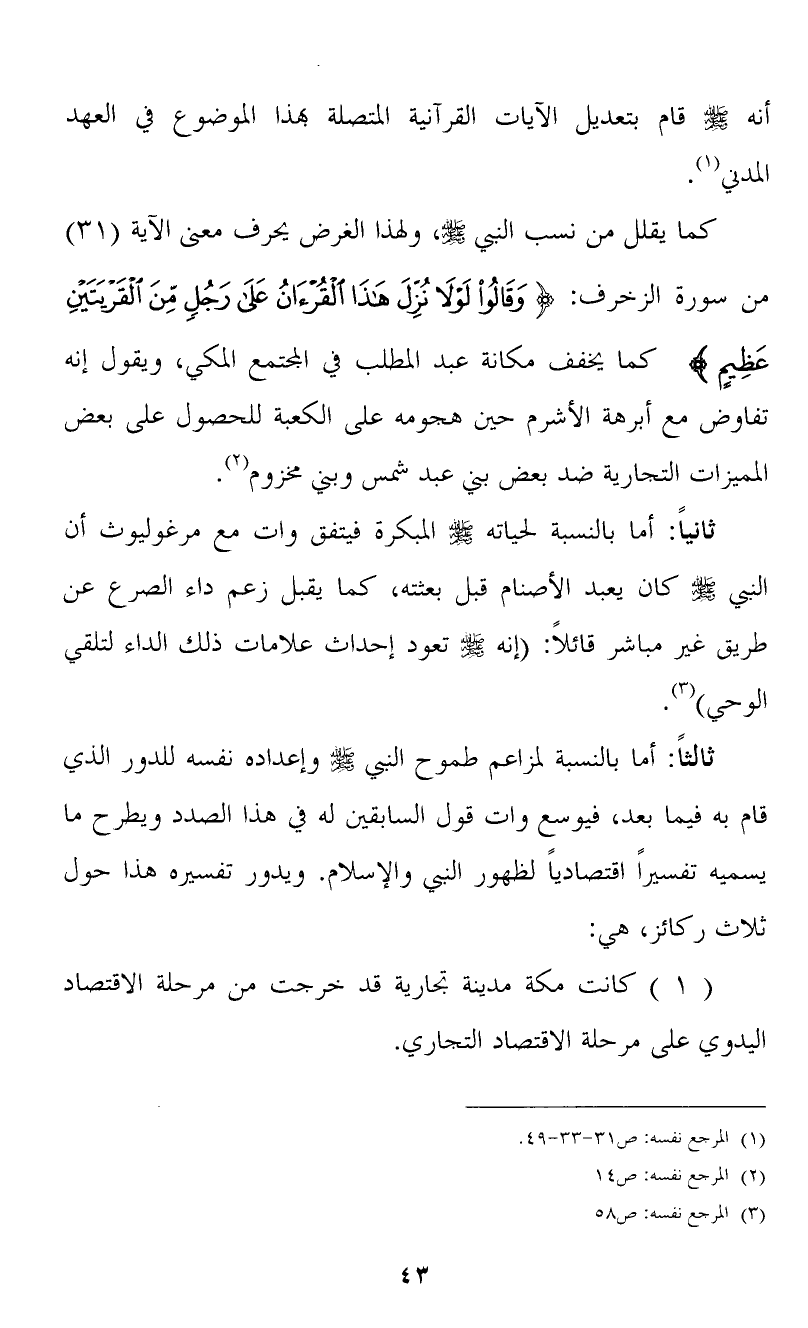 كما يقلل من نسب النبي صلى الله عليه وسلم، ولهذا الغرض يحرف معنى الآية (31) من سورة الزخرف: {وَقَالُوا لَوْلا نُزِّلَ هَذَا الْقُرْآنُ عَلَى رَجُلٍ مِنَ الْقَرْيَتَيْنِ عَظِيمٍ} كما يخفف مكانة عبد المطلب في المجتمع المكي، ويقول إنه تفاوض مع أبرهة الأشرم حين هجومه على الكعبة للحصول على بعض المميزات التجارية ضد بعض بني عبد شمس وبني مخزوم (2) .