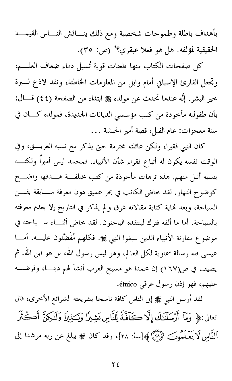 كان النبي فقيرا، ولكن عائلته محترمة حتى يذكر مع نسبه العريق، وفي الوقت نفسه يكون له أتباع فقراء شأن الأنبياء. فمحمد ليس أميراً ولكنه بنسبه أنبل منهم. هذه ترهات مأخوذة من كتب مختلفة هدفها واضح كوضوح النهار. لقد خاض الكاتب في بحر عميق دون معرفة سابقة بفن السباحة، وبعد نهاية كتابة مقالاته غرق ولم يذكر في التاريخ إلا بعدم معرفته بالسباحة. أما ما ألفه فترك لينتقده الباحثون. لقد خاض أثناء سباحته في موضوع مقارنة الأنبياء الذين سبقوا النبي صلى الله عليه وسلم. فكلهم مُفَضَّلون عليه. أما عيسى فله رسالة سماوية لكل العالم، وهو ليس رسول الله، بل هو ابن الله. ثم يضيف في ص (167) إن محمدا هو مسيح العرب أنشأ لهم دينا، وفرضه عليهم، فهو إذن رسول عرقي étnico.