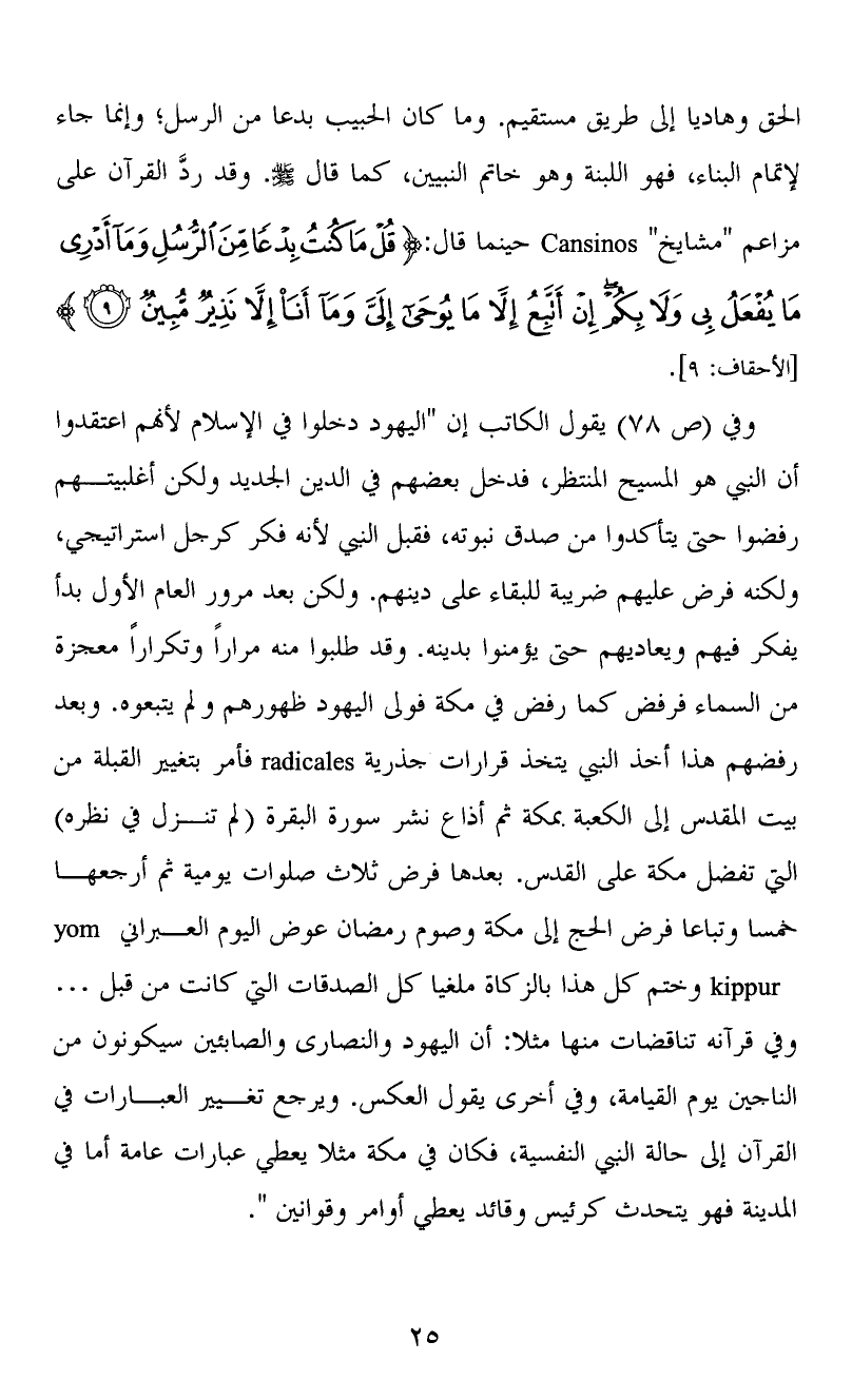 وفي (ص 78) يقول الكاتب إن "اليهود دخلوا في الإسلام لأنهم اعتقدوا أن النبي هو المسيح المنتظر، فدخل بعضهم في الدين الجديد ولكن أغلبيتهم رفضوا حتى يتأكدوا من صدق نبوته، فقبل النبي لأنه فكر كرجل استراتيجي، ولكنه فرض عليهم ضريبة للبقاء على دينهم. ولكن بعد مرور العام الأول بدأ يفكر فيهم ويعاديهم حتى يؤمنوا بدينه. وقد طلبوا منه مراراً وتكراراً معجزة من السماء فرفض كما رفض في مكة فولى اليهود ظهورهم ولم يتبعوه. وبعد رفضهم هذا أخذ النبي يتخذ قرارات جذرية radicales فأمر بتغيير القبلة من بيت المقدس إلى الكعبة بمكة ثم أذاع نشر سورة البقرة (لم تنزل في نظره) التي تفضل مكة على القدس. بعدها فرض ثلاث صلوات يومية ثم أرجعها خمسا وتباعا فرض الحج إلى مكة وصوم رمضان عوض اليوم العبراني yom kippur وختم كل هذا بالزكاة ملغيا كل الصدقات التي كانت من قبل … وفي قرآنه تناقضات منها مثلا: أن اليهود والنصارى والصابئين سيكونون من الناجين يوم القيامة، وفي أخرى يقول العكس. ويرجع تغيير العبارات في القرآن إلى حالة النبي النفسية، فكان في مكة مثلا يعطي عبارات عامة أما في المدينة فهو يتحدث كرئيس وقائد يعطي أوامر وقوانين ".