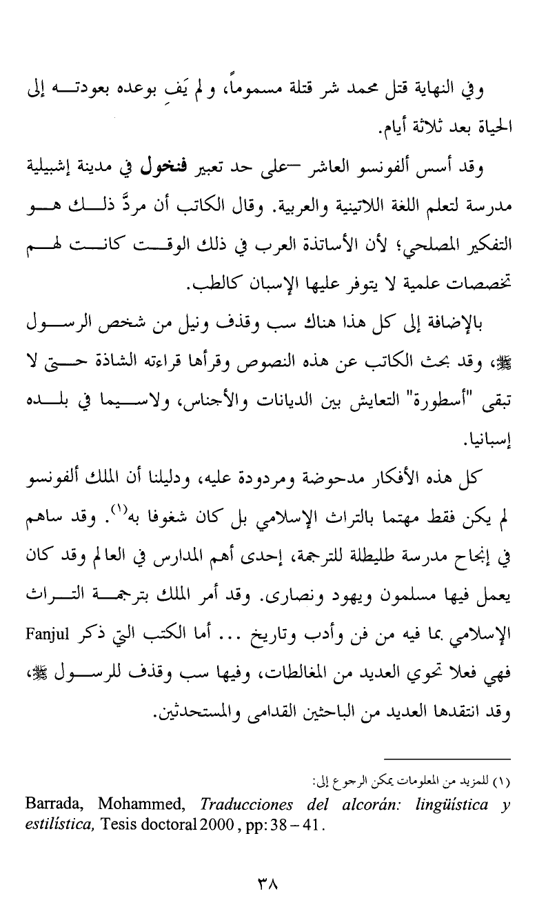 كل هذه الأفكار مدحوضة ومردودة عليه، ودليلنا أن الملك ألفونسو لم يكن فقط مهتما بالتراث الإسلامي بل كان شغوفا به (1) . وقد ساهم في إنجاح مدرسة طليطلة للترجمة، إحدى أهم المدارس في العالم وقد كان يعمل فيها مسلمون ويهود ونصارى. وقد أمر الملك بترجمة التراث الإسلامي بما فيه من فن وأدب وتاريخ … أما الكتب التي ذكر Fanjul فهي فعلا تحوي العديد من المغالطات، وفيها سب وقذف للرسول صلى الله عليه وسلم، وقد انتقدها العديد من الباحثين القدامى والمستحدثين.