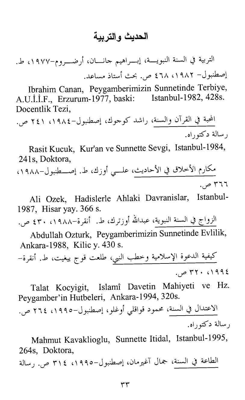 التربية في السنة النبوية، إبراهيم جانان، أرضروم-1977، ط. إصطنبول- 1982، 468 ص. بحث أستاذ مساعد.