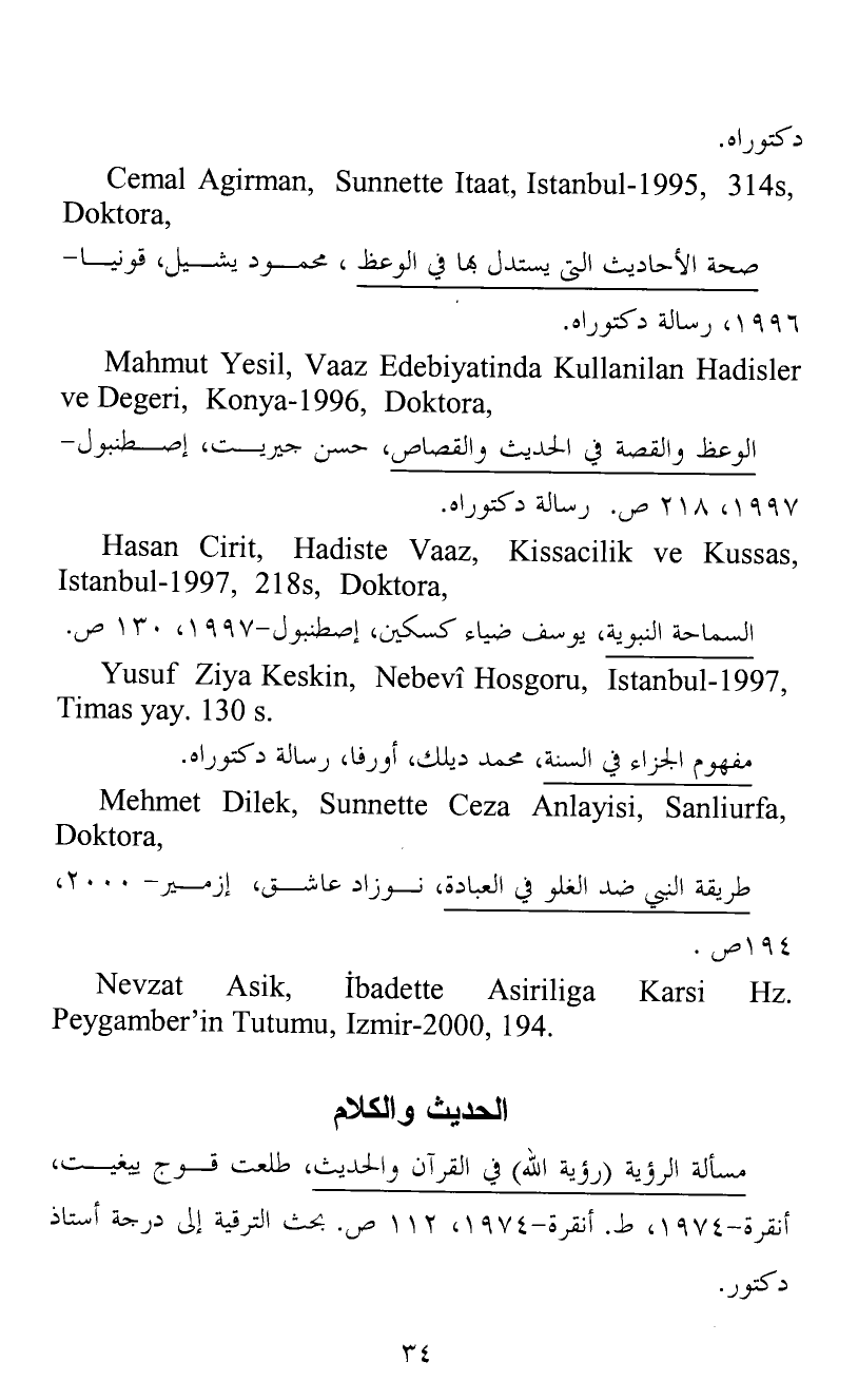 مسألة الرؤية "رؤية الله" في القرآن والحديث، طلعت قوج ييغيت، أنقرة-1974، ط. أنقرة-1974، 112 ص. بحث الترقية إلى درجة أستاذ دكتور.