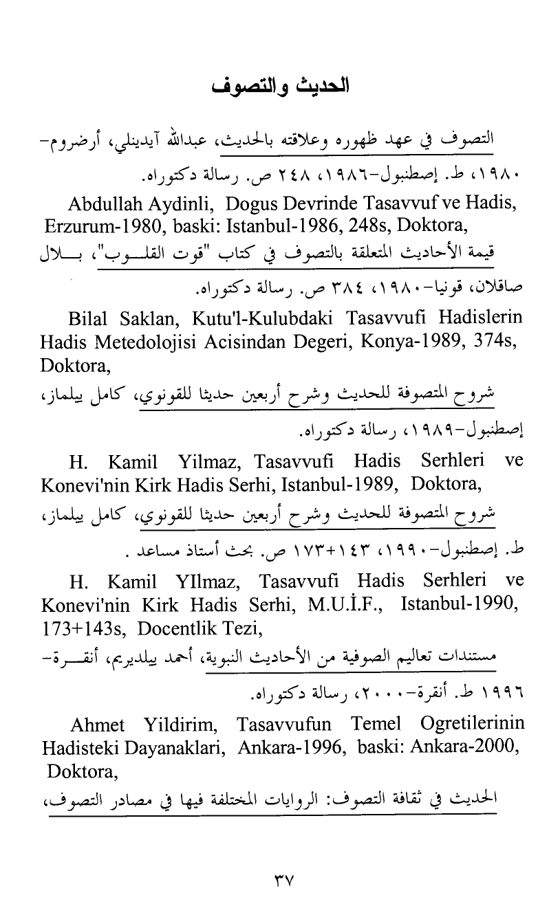 مستندات تعاليم الصوفية من الأحاديث النبوية، أحمد ييلديريم، أنقرة-1996 ط. أنقرة-2000، رسالة دكتوراه.