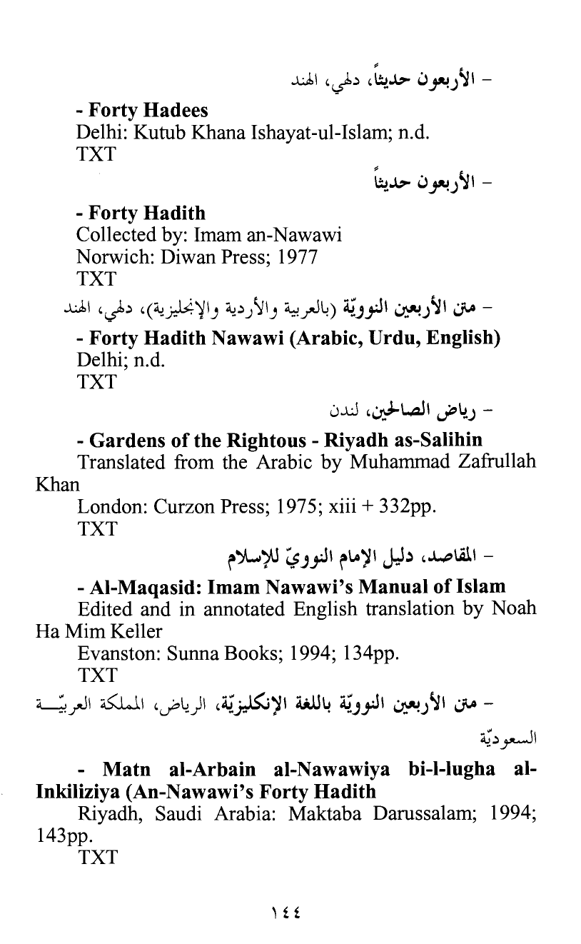 - Matn al-Arbain al-Nawawiya bi-l-lugha al-Inkiliziya (An-Nawawi’s Forty Hadith
