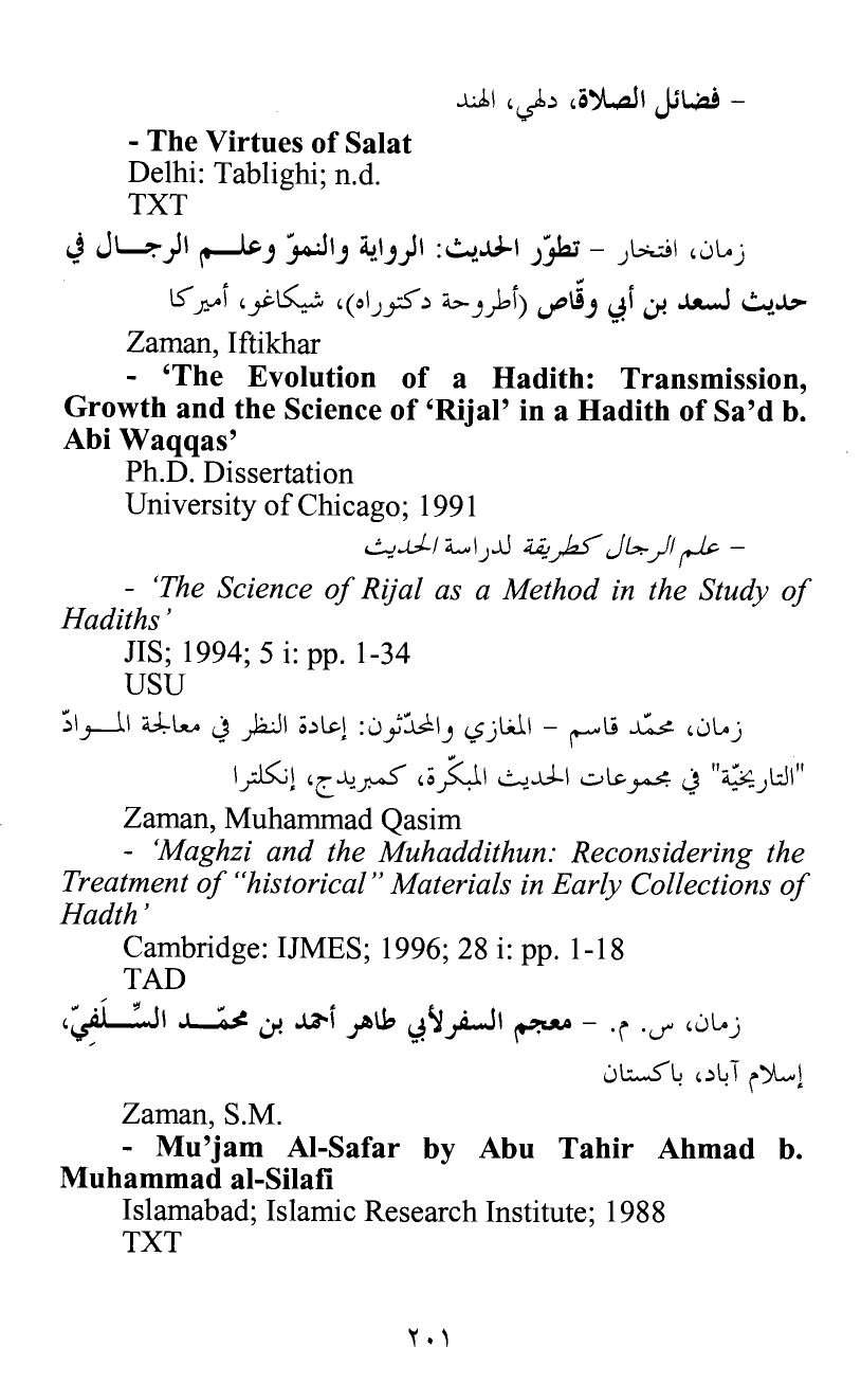 زمان، افتخار - تطوّر الحديث: الرواية والنموّ وعلم الرجال في حديث لسعد بن أبي وقّاص (أطروحة دكتوراه) ، شيكاغو، أميركا