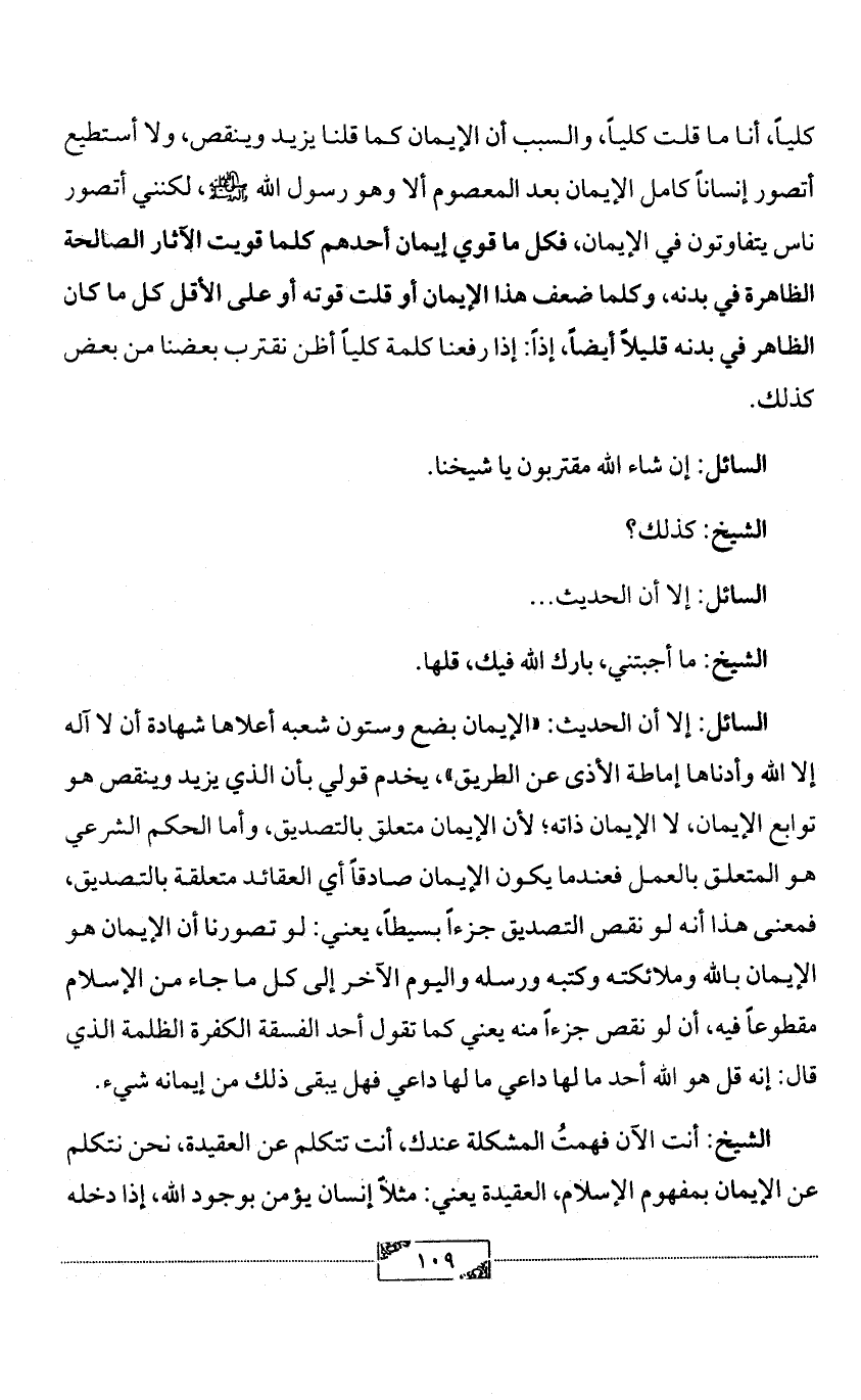 كلياً، أنا ما قلت كلياً، والسبب أن الإيمان كما قلنا يزيد وينقص، ولا أستطيع أتصور إنساناً كامل الإيمان بعد المعصوم ألا وهو رسول الله - صلى الله عليه وآله وسلم -، لكنني أتصور ناس يتفاوتون في الإيمان، فكل ما قوي إيمان أحدهم كلما قويت الآثار الصالحة الظاهرة في بدنه، وكلما ضعف هذا الإيمان أو قلت قوته أو على الأقل كل ما كان الظاهر في بدنه قليلاً أيضاً، إذاً: إذا رفعنا كلمة كلياً أظن نقترب بعضنا من بعض كذلك.