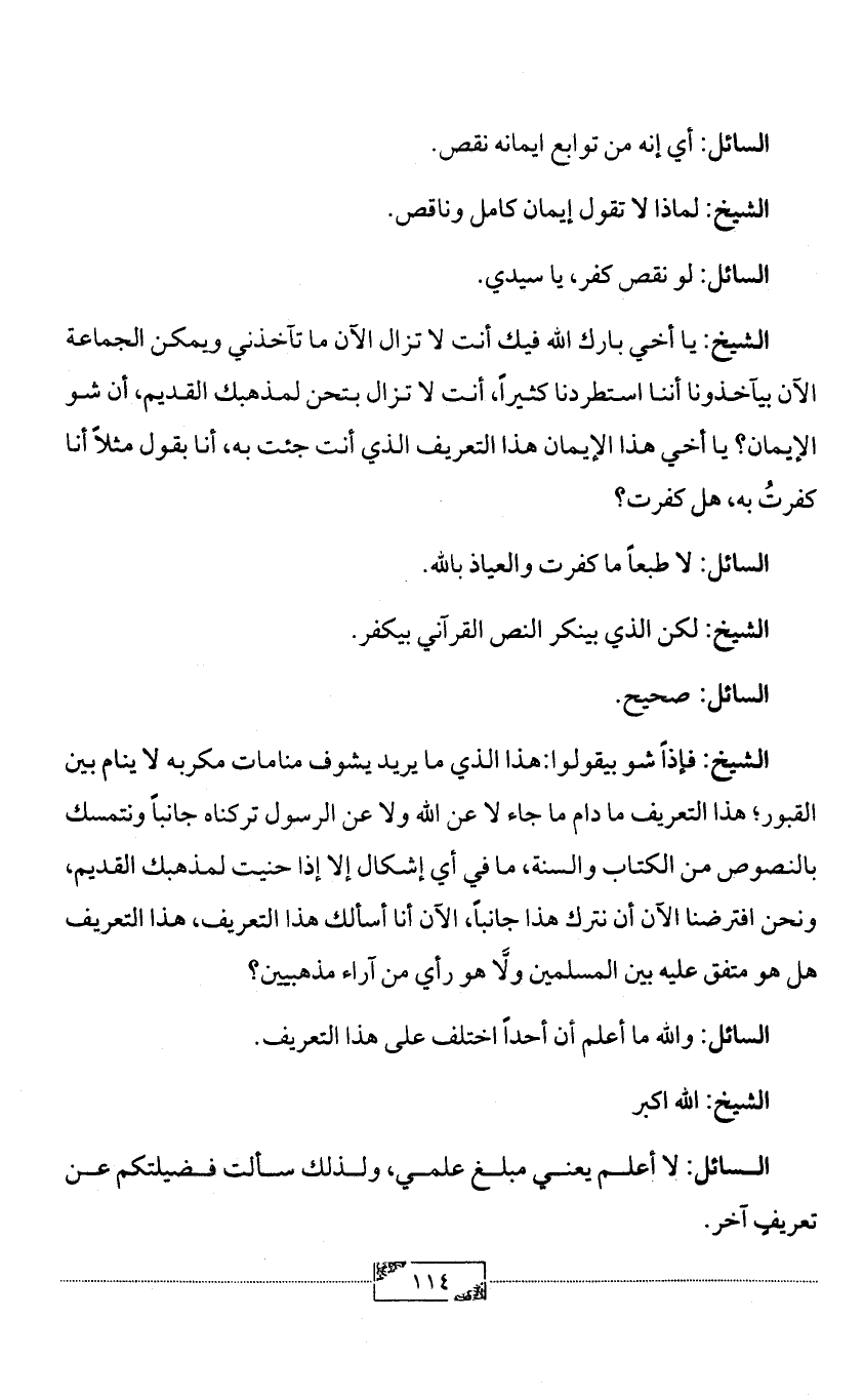 الشيخ: يا أخي بارك الله فيك أنت لا تزال الآن ما تآخذني ويمكن الجماعة الآن بيآخذونا أننا استطردنا كثيراً، أنت لا تزال بتحن لمذهبك القديم، أن شو الإيمان؟ يا أخي هذا الإيمان هذا التعريف الذي أنت جئت به، أنا بقول مثلاً أنا كفرتُ به، هل كفرت؟