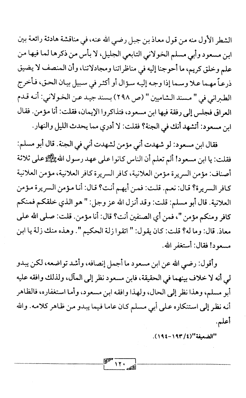 فقال ابن مسعود: لو شهدت أني مؤمن لشهدت أني في الجنة. قال أبو مسلم: فقلت: يا ابن مسعود! ألم تعلم أن الناس كانوا على عهد رسول الله - صلى الله عليه وآله وسلم - على ثلاثة أصناف: مؤمن السريرة مؤمن العلانية، كافر السريرة كافر العلانية، مؤمن العلانية كافر السريرة؟ قال: نعم. قلت: فمن أيهم أنت؟ قال: أنا مؤمن السريرة مؤمن العلانية. قال أبو مسلم: قلت: وقد أنزل الله عز وجل: " هو الذي خلقكم فمنكم كافر ومنكم مؤمن "، فمن أي الصنفين أنت؟ قال: أنا مؤمن. قلت: صلى الله على معاذ. قال: وما له؟ قلت: كان يقول: " اتقوا زلة الحكيم ". وهذه منك زلة يا ابن مسعود! فقال: أستغفر الله.