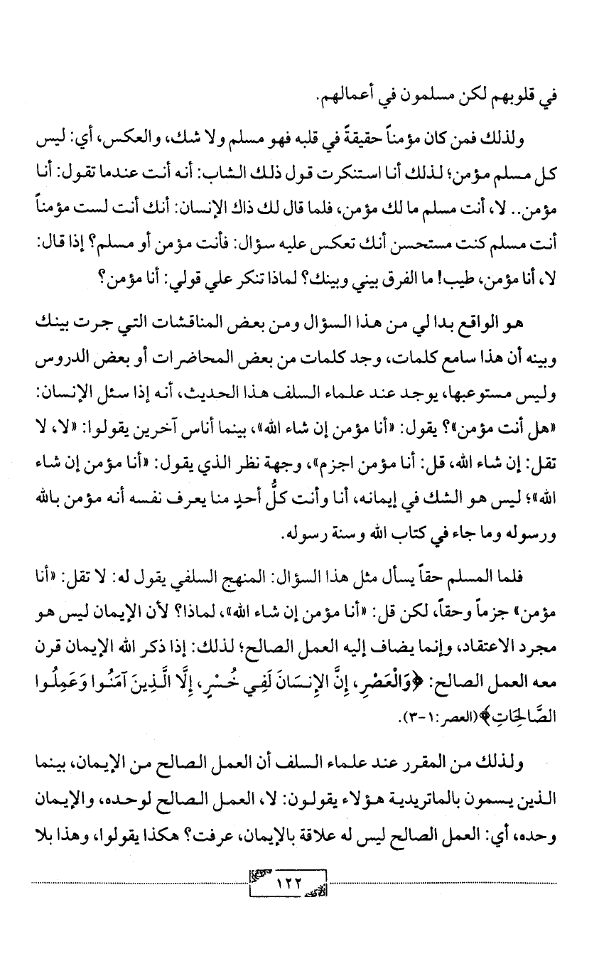 فلما المسلم حقاً يسأل مثل هذا السؤال: المنهج السلفي يقول له: لا تقل: «أنا مؤمن» جزماً وحقاً، لكن قل: «أنا مؤمن إن شاء الله»، لماذا؟ لأن الإيمان ليس هو مجرد الاعتقاد، وإنما يضاف إليه العمل الصالح؛ لذلك: إذا ذكر الله الإيمان قرن معه العمل الصالح: {وَالْعَصْرِ، إِنَّ الإِنسَانَ لَفِي خُسْرٍ، إِلَّا الَّذِينَ آمَنُوا وَعَمِلُوا الصَّالِحَاتِ} (العصر:1 - 3).