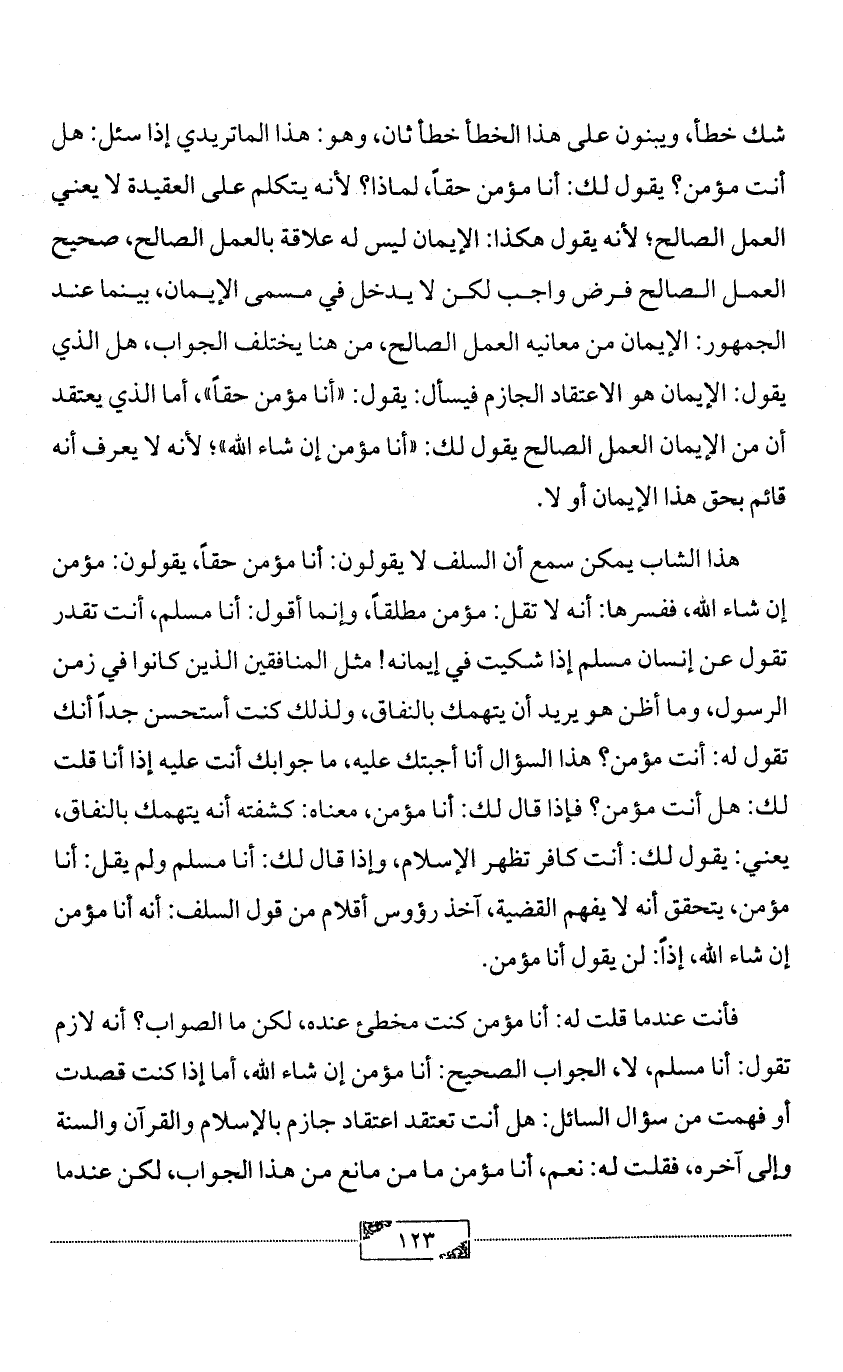 شك خطأ، ويبنون على هذا الخطأ خطأ ثان، وهو: هذا الماتريدي إذا سئل: هل أنت مؤمن؟ يقول لك: أنا مؤمن حقاً، لماذا؟ لأنه يتكلم على العقيدة لا يعني العمل الصالح؛ لأنه يقول هكذا: الإيمان ليس له علاقة بالعمل الصالح، صحيح العمل الصالح فرض واجب لكن لا يدخل في مسمى الإيمان، بينما عند الجمهور: الإيمان من معانيه العمل الصالح، من هنا يختلف الجواب، هل الذي يقول: الإيمان هو الاعتقاد الجازم فيسأل: يقول: «أنا مؤمن حقاً»، أما الذي يعتقد أن من الإيمان العمل الصالح يقول لك: «أنا مؤمن إن شاء الله»؛ لأنه لا يعرف أنه قائم بحق هذا الإيمان أو لا.