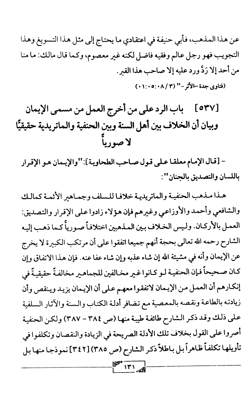 هذا مذهب الحنفية والماتريدية خلافا للسلف وجماهير الأئمة كمالك والشافعي وأحمد والأوزاعي وغيرهم فإن هؤلاء زادوا على الإقرار والتصديق: العمل بالأركان. وليس الخلاف بين المذهبين اختلافاً صورياًّ كما ذهب إليه الشارح رحمه الله تعالى بحجة أنهم جميعا اتفقوا على أن مرتكب الكبيرة لا يخرج عن الإيمان وأنه في مشيئة الله إن شاء عذبه وإن شاء عفا عنه. فإن هذا الاتفاق وإن كان صحيحاً فإن الحنفية لو كانوا غير مخالفين للجماهير مخالفةً حقيقيةً في إنكارهم أن العمل من الإيمان لاتفقوا معهم على أن الإيمان يزيد وينقص وأن زيادته بالطاعة ونقصه بالمعصية مع تضافر أدلة الكتاب والسنة والآثار السلفية على ذلك وقد ذكر الشارح طائفة طيبة منها (ص 384 - 387) ولكن الحنفية أصروا على القول بخلاف تلك الأدلة الصريحة في الزيادة والنقصان وتكلفوا في تأويلها تكلفاً ظاهراً بل باطلاً ذكر الشارح (ص 385) [342] نموذجا منها بل
