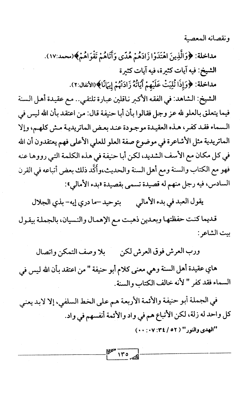 الشيخ: الشاهد: في الفقه الأكبر ناقلين عبارة تلتقي .. مع عقيدة أهل السنة فيما يتعلق بالعلو لله عز وجل فقالوا بأن أبا حنيفة قال: من اعتقد بأن الله ليس في السماء فقد كفر, هذه العقيدة موجودة عند بعض الماتريدية مش كلهم، وإلا الماتريدية مثل الأشاعرة في موضوع صفة العلو للعلي الأعلى فهم يعتقدون أن الله في كل مكان مع الأسف الشديد، لكن أبا حنيفة في هذه الكلمة التي رووها عنه فهو مع الكتاب والسنة ومع أهل السنة والحديث، وأَكَّد ذلك بعض أتباعه في القرن السادس, فيه رجل منهم له قصيدة تسمى بقصيدة «بدء الأمالي»:
