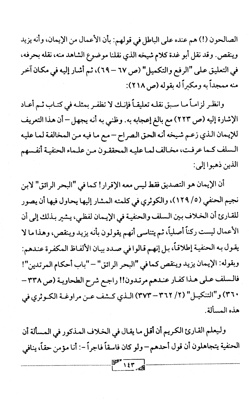 أن الإيمان هو التصديق فقط ليس معه الإقرار! كما في "البحر الرائق" لابن نجيم الحنفي (5/ 129) , والكوثري في كلمته المشار إليها يحاول فيها أن يصور للقارئ أن الخلاف بين السلف والحنفية في الإيمان لفظي, يشير بذلك إلى أن الأعمال ليست ركناً أصلياً, ثم يتناسى أنهم يقولون بأنه يزيد وينقص, وهذا ما لا يقول به الحنفية إطلاقاً, بل إنهم قالوا في صدد بيان الألفاظ المكفرة عندهم: وبقوله: الإيمان يزيد وينقص كما في "البحر الرائق" - "باب أحكام المرتدين"! فالسلف على هذا كفار عندهم مرتدون!! راجع شرح الطحاوية (ص 338 - 360) و"التنكيل" (2/ 362 - 373) الذي كشف عن مراوغة الكوثري في