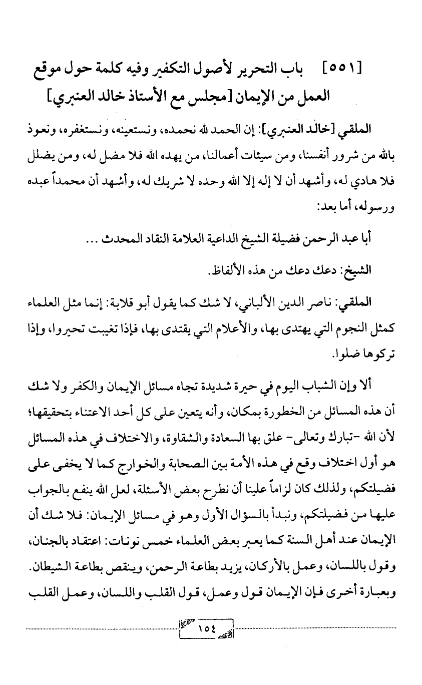 [551] باب التحرير لأصول التكفير وفيه كلمة حول موقع العمل من الإيمان [مجلس مع الأستاذ خالد العنبري]