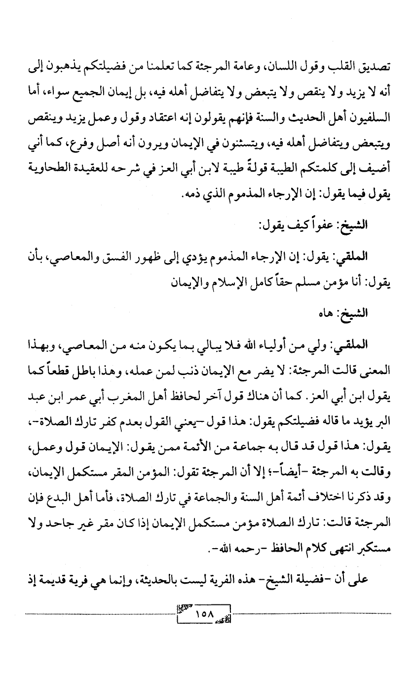 الملقي: ولي من أولياء الله فلا يبالي بما يكون منه من المعاصي، وبهذا المعنى قالت المرجئة: لا يضر مع الإيمان ذنب لمن عمله، وهذا باطل قطعاً كما يقول ابن أبي العز. كما أن هناك قول آخر لحافظ أهل المغرب أبي عمر ابن عبد البر يؤيد ما قاله فضيلتكم يقول: هذا قول -يعني القول بعدم كفر تارك الصلاة-، يقول: هذا قول قد قال به جماعة من الأئمة ممن يقول: الإيمان قول وعمل، وقالت به المرجئة -أيضاً-؛ إلا أن المرجئة تقول: المؤمن المقر مستكمل الإيمان، وقد ذكرنا اختلاف أئمة أهل السنة والجماعة في تارك الصلاة، فأما أهل البدع فإن المرجئة قالت: تارك الصلاة مؤمن مستكمل الإيمان إذا كان مقر غير جاحد ولا مستكبر انتهى كلام الحافظ -رحمه الله-.