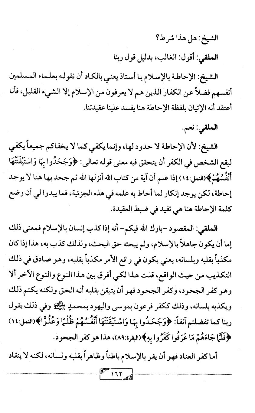 الشيخ: لأن الإحاطة لا حدود لها، وإنما يكفي كما لا يخفاكم جميعاً يكفي ليقع الشخص في الكفر أن يتحقق فيه معنى قوله تعالى: {وَجَحَدُوا بِهَا وَاسْتَيْقَنَتْهَا أَنْفُسُهُمْ} (النمل:14) إذا علم أن آية من كتاب الله أنزلها الله ثم جحد بها هنا لا يوجد إحاطة، لكن يوجد إنكار لما أحاط به علمه في هذه الجزئية، فما يبدوا لي أن وضع كلمة الإحاطة هنا هي تفيد في ضبط العقيدة.