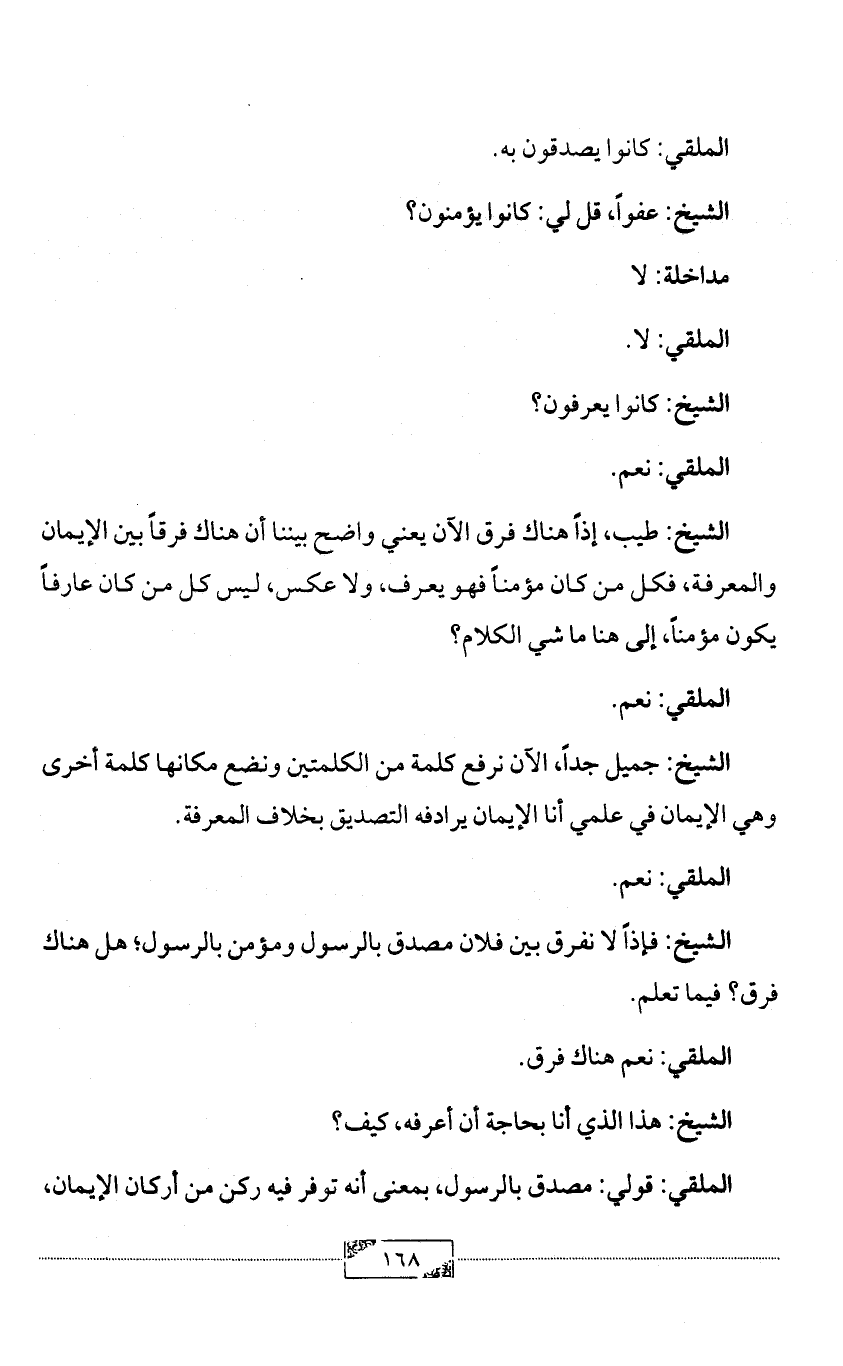 الشيخ: جميل جداً، الآن نرفع كلمة من الكلمتين ونضع مكانها كلمة أخرى وهي الإيمان في علمي أنا الإيمان يرادفه التصديق بخلاف المعرفة.