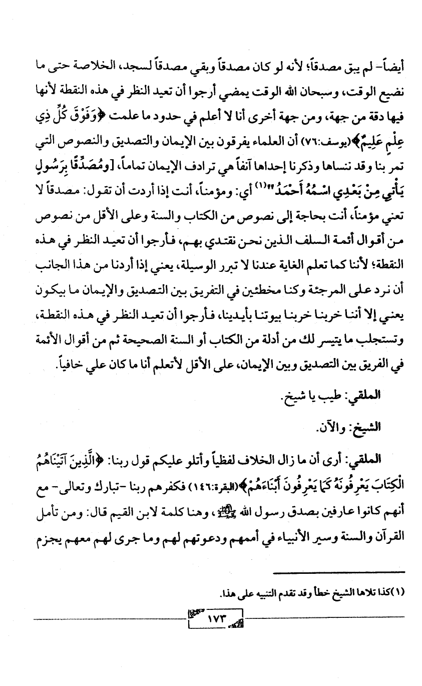 الملقي: أرى أن ما زال الخلاف لفظياً وأتلو عليكم قول ربنا: {الَّذِينَ آتَيْنَاهُمُ الْكِتَابَ يَعْرِفُونَهُ كَمَا يَعْرِفُونَ أَبْنَاءَهُمْ} (البقرة:146) فكفرهم ربنا -تبارك وتعالى- مع أنهم كانوا عارفين بصدق رسول الله - صلى الله عليه وآله وسلم -، وهنا كلمة لابن القيم قال: ومن تأمل القرآن والسنة وسير الأنبياء في أممهم ودعوتهم لهم وما جرى لهم معهم يجزم