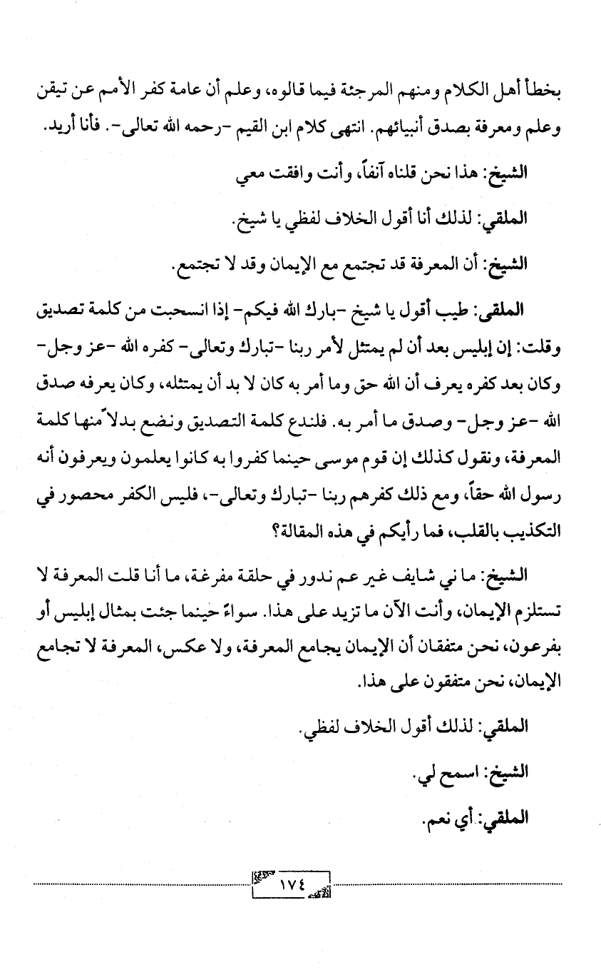 الشيخ: ما ني شايف غير عم ندور في حلقة مفرغة، ما أنا قلت المعرفة لا تستلزم الإيمان، وأنت الآن ما تزيد على هذا. سواءً حينما جئت بمثال إبليس أو بفرعون، نحن متفقان أن الإيمان يجامع المعرفة، ولا عكس، المعرفة لا تجامع الإيمان، نحن متفقون على هذا.