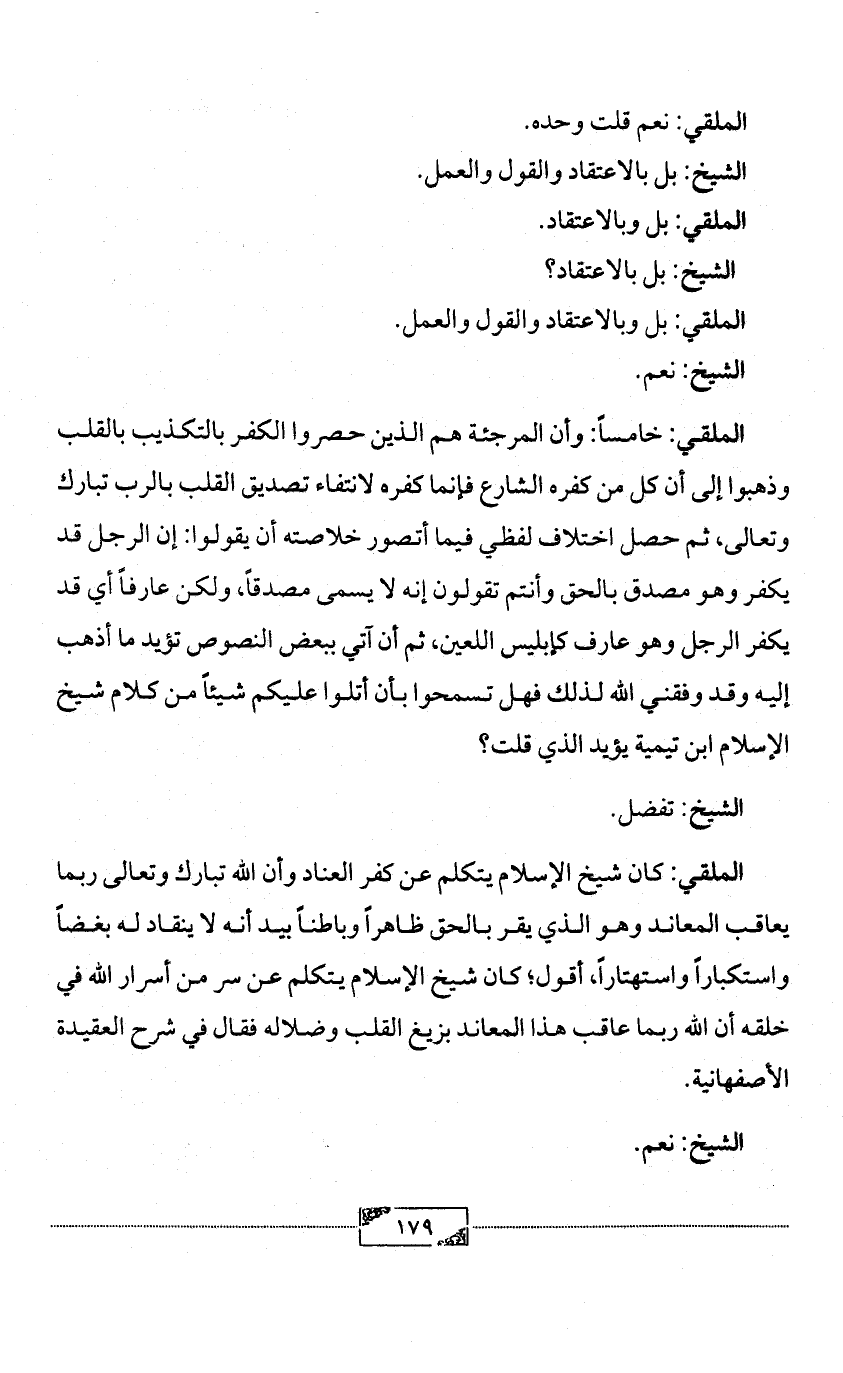 الملقي: خامساً: وأن المرجئة هم الذين حصروا الكفر بالتكذيب بالقلب وذهبوا إلى أن كل من كفره الشارع فإنما كفره لانتفاء تصديق القلب بالرب تبارك وتعالى، ثم حصل اختلاف لفظي فيما أتصور خلاصته أن يقولوا: إن الرجل قد يكفر وهو مصدق بالحق وأنتم تقولون إنه لا يسمى مصدقاً، ولكن عارفاً أي قد يكفر الرجل وهو عارف كإبليس اللعين، ثم أن آتي ببعض النصوص تؤيد ما أذهب إليه وقد وفقني الله لذلك فهل تسمحوا بأن أتلوا عليكم شيئاً من كلام شيخ الإسلام ابن تيمية يؤيد الذي قلت؟