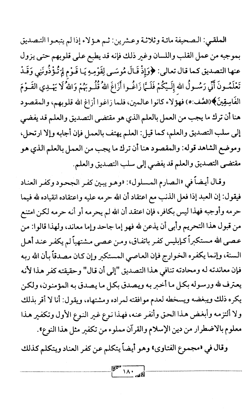 الملقي: الصحيفة مائة وثلاثة وعشرين: ثم هؤلاء إذا لم يتبعوا التصديق بموجبه من عمل القلب واللسان وغير ذلك فإنه قد يطبع على قلوبهم حتى يزول عنها التصديق كما قال تعالى: {وَإِذْ قَالَ مُوسَى لِقَوْمِهِ يَا قَوْمِ لِمَ تُؤْذُونَنِي وَقَدْ تَعْلَمُونَ أَنِّي رَسُولُ اللهِ إِلَيْكُمْ فَلَمَّا زَاغُوا أَزَاغَ اللهُ قُلُوبَهُمْ وَاللهُ لَا يَهْدِي القَوْمَ الفَاسِقِينَ} (الصَّف:5) فهؤلاء كانوا عالمين، فلما زاغوا أزاغ الله قلوبهم، والمقصود هنا أن ترك ما يجب من العمل بالعلم الذي هو مقتضى التصديق والعلم قد يفضي إلى سلب التصديق والعلم، كما قيل: العلم يهتف بالعمل فإن أجابه وإلا ارتحل، وموضع الشاهد قوله: والمقصود هنا أن ترك ما يجب من العمل بالعلم الذي هو مقتضى التصديق والعلم قد يفضي إلى سلب التصديق والعلم.