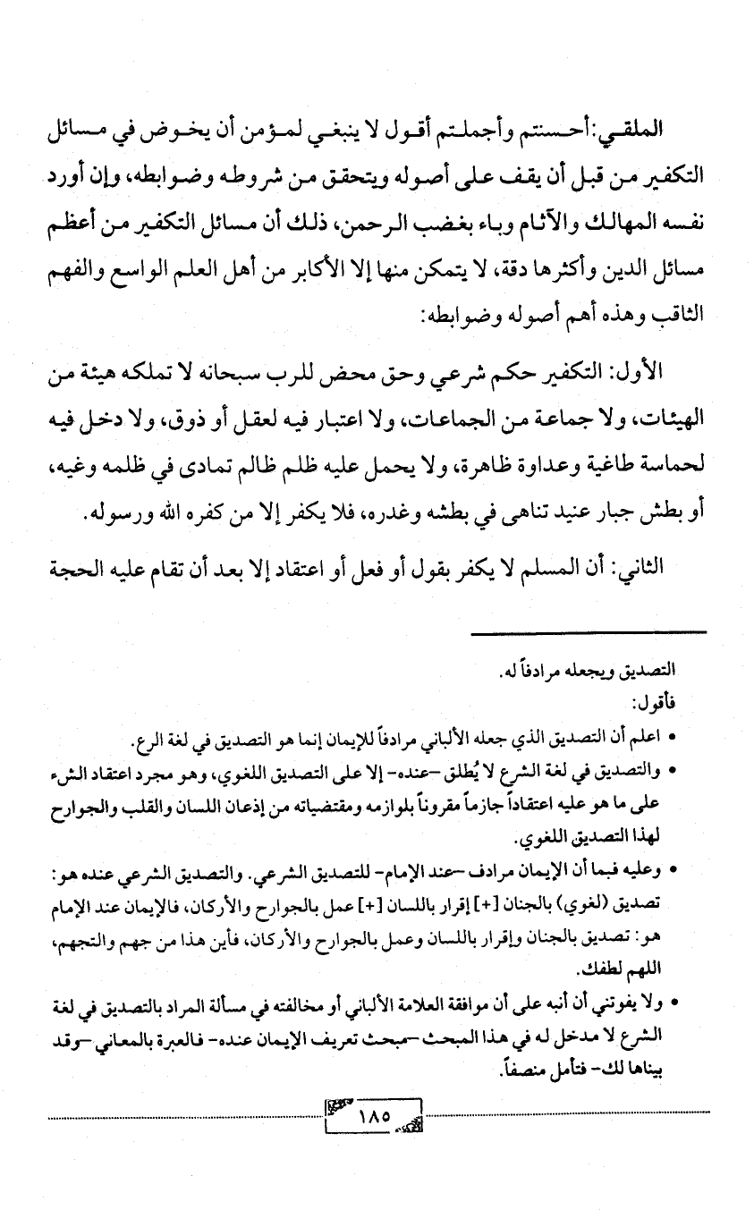 الملقي: أحسنتم وأجملتم أقول لا ينبغي لمؤمن أن يخوض في مسائل التكفير من قبل أن يقف على أصوله ويتحقق من شروطه وضوابطه، وإن أورد نفسه المهالك والآثام وباء بغضب الرحمن، ذلك أن مسائل التكفير من أعظم مسائل الدين وأكثرها دقة، لا يتمكن منها إلا الأكابر من أهل العلم الواسع والفهم الثاقب وهذه أهم أصوله وضوابطه: