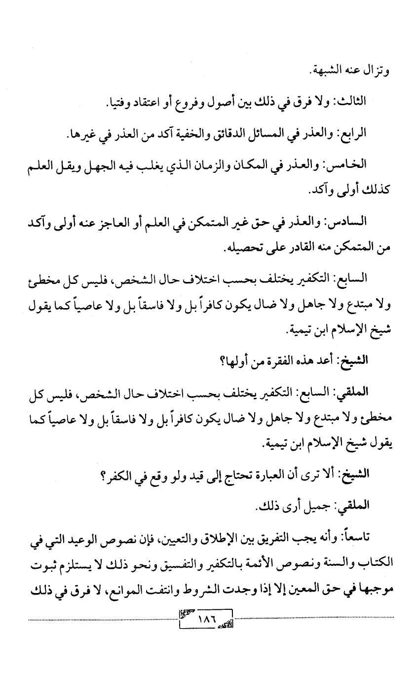 الملقي: السابع: التكفير يختلف بحسب اختلاف حال الشخص، فليس كل مخطئ ولا مبتدع ولا جاهل ولا ضال يكون كافراً بل ولا فاسقاً بل ولا عاصياً كما يقول شيخ الإسلام ابن تيمية.