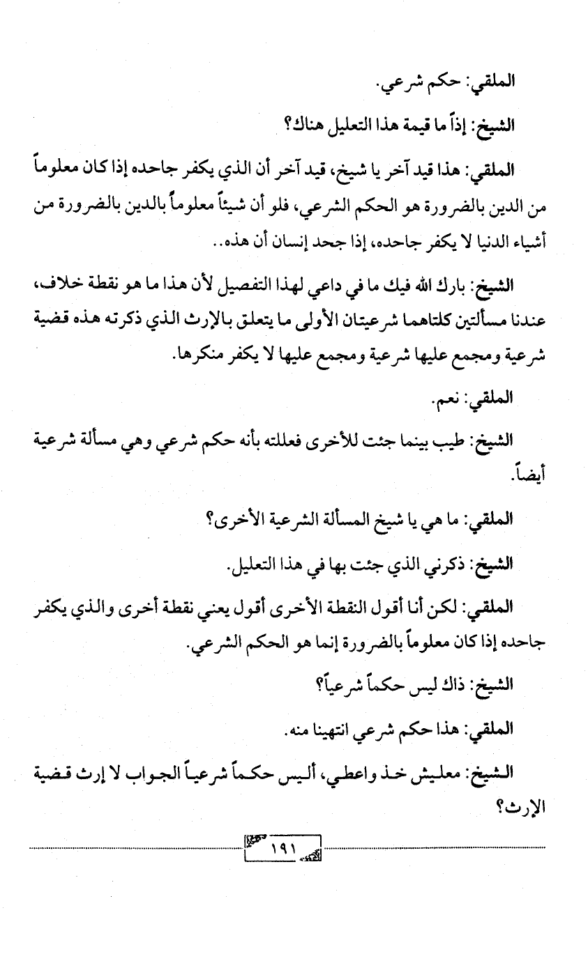الملقي: لكن أنا أقول النقطة الأخرى أقول يعني نقطة أخرى والذي يكفر جاحده إذا كان معلوماً بالضرورة إنما هو الحكم الشرعي.