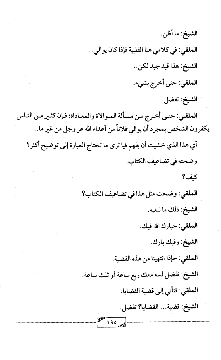 الملقي: حتى أخرج من مسألة الموالاة والمعاداة؛ فإن كثير من الناس يكفرون الشخص بمجرد أن يوالي فلاناً من أعداء الله عز وجل من غير ما ..