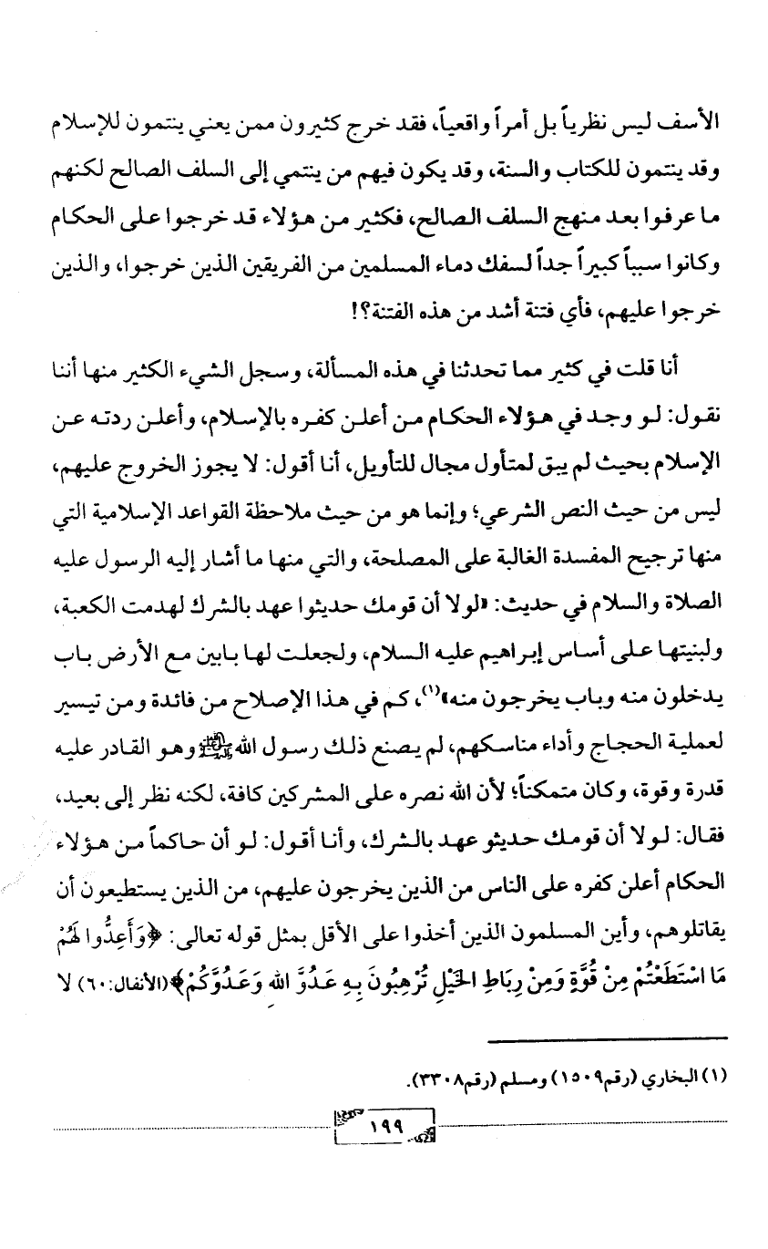 أنا قلت في كثير مما تحدثنا في هذه المسألة، وسجل الشيء الكثير منها أننا نقول: لو وجد في هؤلاء الحكام من أعلن كفره بالإسلام، وأعلن ردته عن الإسلام بحيث لم يبق لمتأول مجال للتأويل، أنا أقول: لا يجوز الخروج عليهم، ليس من حيث النص الشرعي؛ وإنما هو من حيث ملاحظة القواعد الإسلامية التي منها ترجيح المفسدة الغالبة على المصلحة، والتي منها ما أشار إليه الرسول عليه الصلاة والسلام في حديث: «لولا أنا قومك حديثوا عهد بالشرك لهدمت الكعبة، ولبنيتها على أساس إبراهيم عليه السلام، ولجعلت لها بابين مع الأرض باب يدخلون منه وباب يخرجون منه» (¬1)، كم في هذا الإصلاح من فائدة ومن تيسير لعملية الحجاج وأداء مناسكهم، لم يصنع ذلك رسول الله - صلى الله عليه وآله وسلم - وهو القادر عليه قدرة وقوة، وكان متمكناً؛ لأن الله نصره على المشركين كافة، لكنه نظر إلى بعيد، فقال: لولا أن قومك حديثو عهد بالشرك، وأنا أقول: لو أن حاكماً من هؤلاء الحكام أعلن كفره على الناس من الذين يخرجون عليهم، من الذين يستطيعون أن يقاتلوهم، وأين المسلمون الذين أخذوا على الأقل بمثل قوله تعالى: {وَأَعِدُّوا لَهُمْ مَا اسْتَطَعْتُمْ مِنْ قُوَّةٍ وَمِنْ رِبَاطِ الخَيْلِ تُرْهِبُونَ بِهِ عَدُوَّ اللهِ وَعَدُوَّكُمْ} (الأنفال:60) لا
