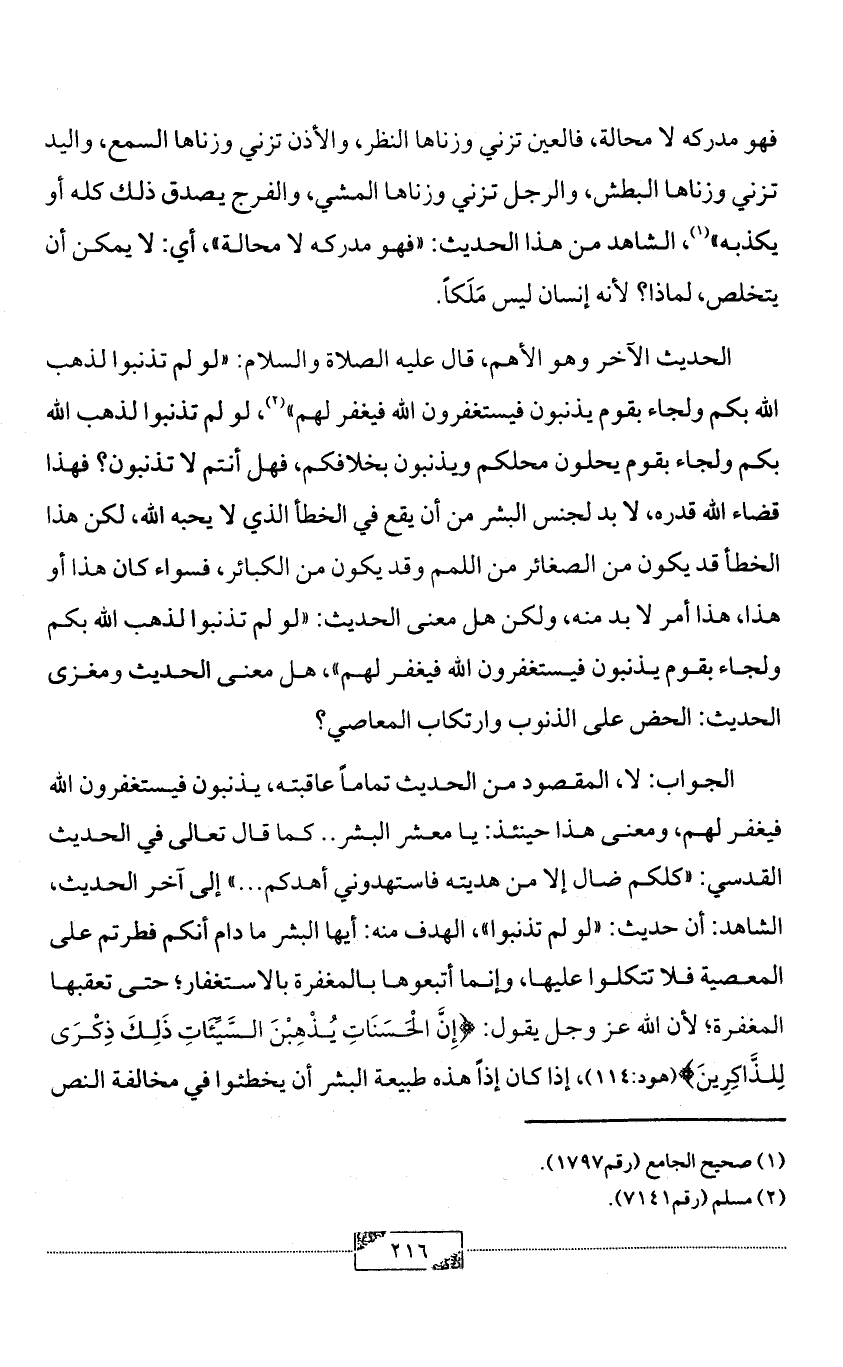 الحديث الآخر وهو الأهم، قال عليه الصلاة والسلام: «لو لم تذنبوا لذهب الله بكم ولجاء بقوم يذنبون فيستغفرون الله فيغفر لهم» (¬2)، لو لم تذنبوا لذهب الله بكم ولجاء بقوم يحلون محلكم ويذنبون بخلافكم، فهل أنتم لا تذنبون؟ فهذا قضاء الله قدره، لا بد لجنس البشر من أن يقع في الخطأ الذي لا يحبه الله، لكن هذا الخطأ قد يكون من الصغائر من اللمم وقد يكون من الكبائر، فسواء كان هذا أو هذا، هذا أمر لا بد منه، ولكن هل معنى الحديث: «لو لم تذنبوا لذهب الله بكم ولجاء بقوم يذنبون فيستغفرون الله فيغفر لهم»، هل معنى الحديث ومغزى الحديث: الحض على الذنوب وارتكاب المعاصي؟