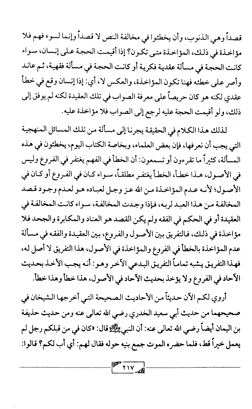 لذلك هذا الكلام في الحقيقة يجرنا إلى مسألة من تلك المسائل المنهجية التي يجب أن نعرفها، فإن بعض العلماء، وبخاصة الكتاب اليوم، يخطئون في هذه المسألة، كثيراً ما تقرءون أو تسمعون: أن الخطأ في الفهم يغتفر في الفروع وليس في الأصول، هذا خطأ، الخطأ يغتفر مطلقاً، سواء كان في الفروع أو كان في الأصول؛ لأنه عدم المؤاخذة من الله عز وجل لعباده هو لعدم وجود قصد المخالفة من هذا العبد لربه، فإذا وجدت المخالفة، سواء كانت المخالفة في العقيدة أو في الحكم في الفقه ولم يكن القصد هو العناد والمكابرة والجحد فلا مؤاخذة في ذلك، فالتفريق بين الأصول والفروع، بين العقيدة والفقه في مسألة عدم المؤاخذة بالخطأ في الفروع والمؤاخذة في الأصول، هذا التفريق لا أصل له، فهذا التفريق يشبه تماماً التفريق البدعي الآخر وهو: أنه يجب الأخذ بحديث الآحاد في الفروع ولا يؤخذ بحديث الآحاد في الأصول، هذا خطأ وهذا خطأ.