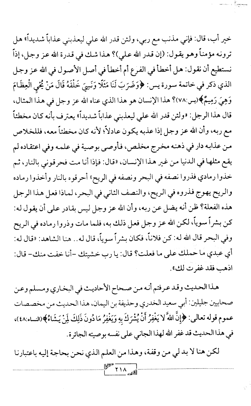 خير أب، قال: فإني مذنب مع ربي، ولئن قدر الله علي ليعذبني عذاباً شديداً» هل ترونه مؤمناً وهو يقول: (إن قدر الله علي)؟ هذا شك في قدرة الله عز وجل، إذاً نستطيع أن نقول: هل أخطأ في الفرع أم أخطأ في أصل الأصول في الله عز وجل الذي ذكر في خاتمة سورة يس: {وَضَرَبَ لَنَا مَثَلًا وَنَسِيَ خَلْقَهُ قَالَ مَنْ يُحْيِ الْعِظَامَ وَهِيَ رَمِيمٌ} (يس:78)؟ هذا الإنسان هو هذا الذي عناه الله عز وجل في هذا المثال، قال هذا الرجل: «ولئن قدر الله علي ليعذبني عذاباً شديداً» يعترف بأنه كان مخطئاً مع ربه، وأن الله عز وجل إذا عذبه يكون عادلاً؛ لأنه كان مخطئاً معه، فللخلاص من عذابه دار في ذهنه مخرج مخلص، فأوصى بوصية في علمه وفي اعتقاده لم يقع مثلها في الدنيا من غير هذا الإنسان، «قال: فإذا أنا مت فحرقوني بالنار، ثم خذوا رمادي فذروا نصفه في البحر ونصفه في الريح» أحرقوه بالنار وأخذوا رماده والريح يهوج فذروه في الريح، والنصف الثاني في البحر، لماذا فعل هذا الرجل هذه الفعلة؟ ظن أنه يضل عن ربه، وأن الله عز وجل ليس بقادر على أن يقول له: كن بشراً سوياً، لكن الله عز وجل فعل ذلك به، فلما مات وذروا رماده في الريح وفي البحر قال الله له: كن فلاناً، فكان بشراً سوياً، قال له .. هنا الشاهد: «قال له: أي عبدي ما حملك على ما فعلت؟ قال: يا رب خشيتك -أنا خفت منك- قال: اذهب فقد غفرت لك».