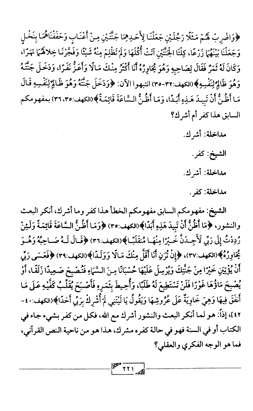 {وَاضْرِبْ لَهُمْ مَثَلًا رَجُلَيْنِ جَعَلْنَا لِأَحَدِهِمَا جَنَّتَيْنِ مِنْ أَعْنَابٍ وَحَفَفْنَاهُمَا بِنَخْلٍ وَجَعَلْنَا بَيْنَهُمَا زَرْعًا، كِلْتَا الْجَنَّتَيْنِ آتَتْ أُكُلَهَا وَلَمْ تَظْلِمْ مِنْهُ شَيْئًا وَفَجَّرْنَا خِلالَهُمَا نَهَرًا، وَكَانَ لَهُ ثَمَرٌ فَقَالَ لِصَاحِبِهِ وَهُوَ يُحَاوِرُهُ أَنَا أَكْثَرُ مِنْكَ مَالًا وَأَعَزُّ نَفَرًا، وَدَخَلَ جَنَّتَهُ وَهُوَ ظَالِمٌ لِنَفْسِهِ} (الكهف:32 - 35) انتبهوا الآن: {وَدَخَلَ جَنَّتَهُ وَهُوَ ظَالِمٌ لِنَفْسِهِ قَالَ مَا أَظُنُّ أَنْ تَبِيدَ هَذِهِ أَبَدًا، وَمَا أَظُنُّ السَّاعَةَ قَائِمَةً} (الكهف:35، 36) بمفهومكم السابق هذا كفر أم أشرك؟