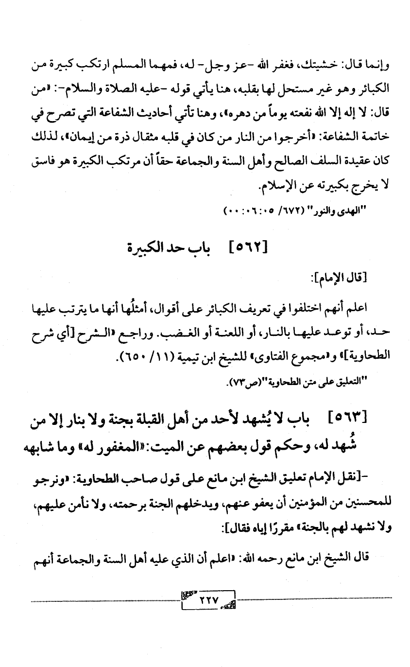 [563] باب لا يُشهد لأحد من أهل القبلة بجنة ولا بنار إلا من شُهد له، وحكم قول بعضهم عن الميت: «المغفور له» وما شابهه