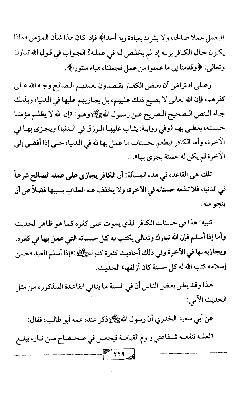 وعلى افتراض أن بعض الكفار يقصدون بعملهم الصالح وجه الله على كفرهم، فإن الله تعالى لا يضيع ذلك عليهم، بل يجازيهم عليها في الدنيا، وبذلك جاء النص الصحيح الصريح عن رسول الله - صلى الله عليه وآله وسلم - وهو: «إن الله لا يظلم مؤمنا حسنته، يعطى بها (وفي رواية: يثاب عليها الرزق في الدنيا) ويجزى بها في الآخرة، وأما الكافر فيطعم بحسنات ما عمل بها لله في الدنيا، حتى إذا أفضى إلى الآخرة لم يكن له حسنة يجزى بها» ...
