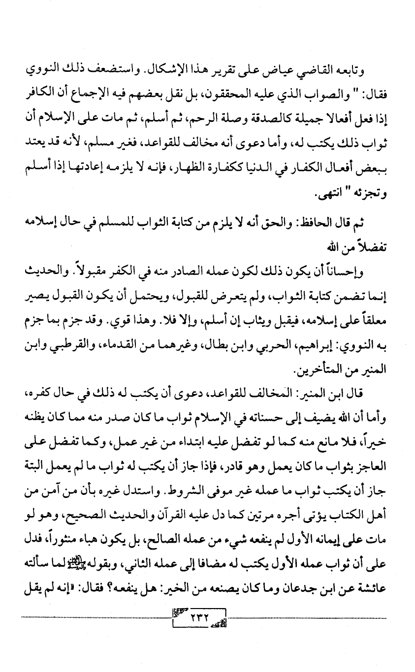 وتابعه القاضي عياض على تقرير هذا الإشكال. واستضعف ذلك النووي فقال: " والصواب الذي عليه المحققون، بل نقل بعضهم فيه الإجماع أن الكافر إذا فعل أفعالا جميلة كالصدقة وصلة الرحم، ثم أسلم، ثم مات على الإسلام أن ثواب ذلك يكتب له، وأما دعوى أنه مخالف للقواعد، فغير مسلم، لأنه قد يعتد ببعض أفعال الكفار في الدنيا ككفارة الظهار، فإنه لا يلزمه إعادتها إذا أسلم وتجزئه " انتهى.