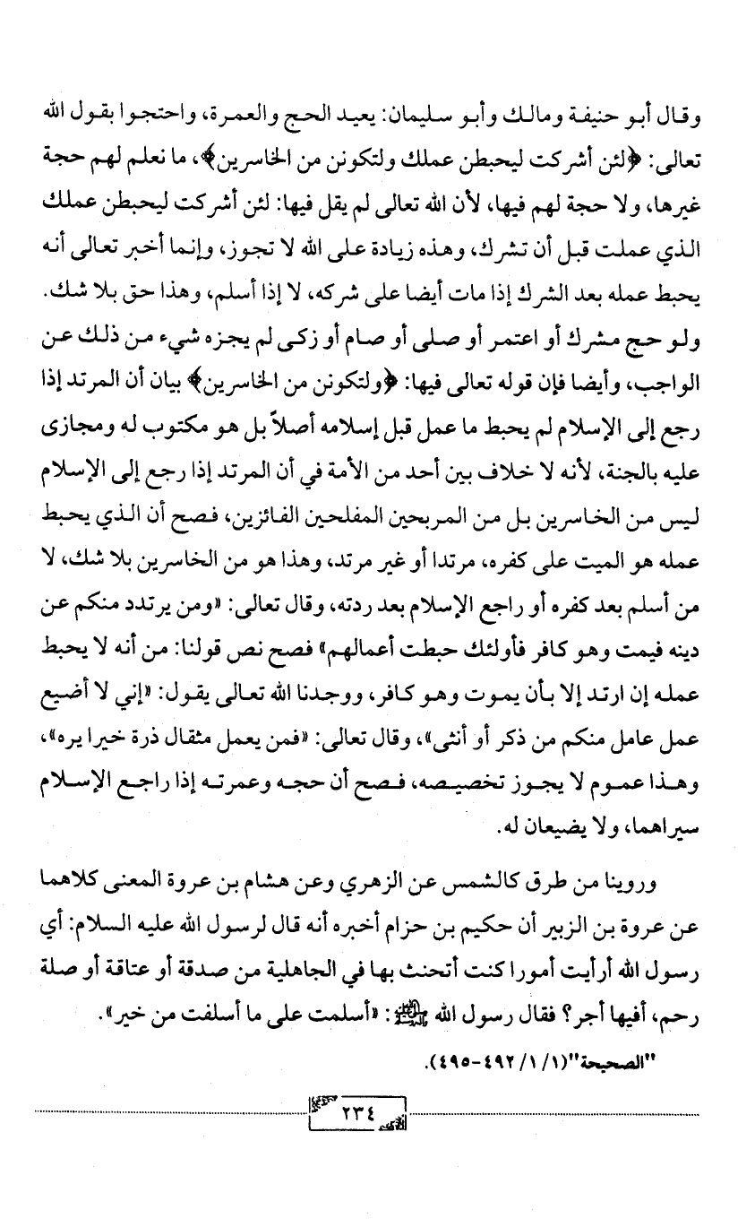 وقال أبو حنيفة ومالك وأبو سليمان: يعيد الحج والعمرة، واحتجوا بقول الله تعالى: {لئن أشركت ليحبطن عملك ولتكونن من الخاسرين}، ما نعلم لهم حجة غيرها، ولا حجة لهم فيها، لأن الله تعالى لم يقل فيها: لئن أشركت ليحبطن عملك الذي عملت قبل أن تشرك، وهذه زيادة على الله لا تجوز، وإنما أخبر تعالى أنه يحبط عمله بعد الشرك إذا مات أيضا على شركه، لا إذا أسلم، وهذا حق بلا شك. ولو حج مشرك أو اعتمر أو صلى أو صام أو زكى لم يجزه شيء من ذلك عن الواجب، وأيضا فإن قوله تعالى فيها: {ولتكونن من الخاسرين} بيان أن المرتد إذا رجع إلى الإسلام لم يحبط ما عمل قبل إسلامه أصلاً بل هو مكتوب له ومجازى عليه بالجنة، لأنه لا خلاف بين أحد من الأمة في أن المرتد إذا رجع إلى الإسلام ليس من الخاسرين بل من المربحين المفلحين الفائزين، فصح أن الذي يحبط عمله هو الميت على كفره، مرتدا أو غير مرتد، وهذا هو من الخاسرين بلا شك، لا من أسلم بعد كفره أو راجع الإسلام بعد ردته، وقال تعالى: «ومن يرتدد منكم عن دينه فيمت وهو كافر فأولئك حبطت أعمالهم» فصح نص قولنا: من أنه لا يحبط عمله إن ارتد إلا بأن يموت وهو كافر، ووجدنا الله تعالى يقول: «إني لا أضيع عمل عامل منكم من ذكر أو أنثى»، وقال تعالى: «فمن يعمل مثقال ذرة خيرا يره»، وهذا عموم لا يجوز تخصيصه، فصح أن حجه وعمرته إذا راجع الإسلام سيراهما، ولا يضيعان له.