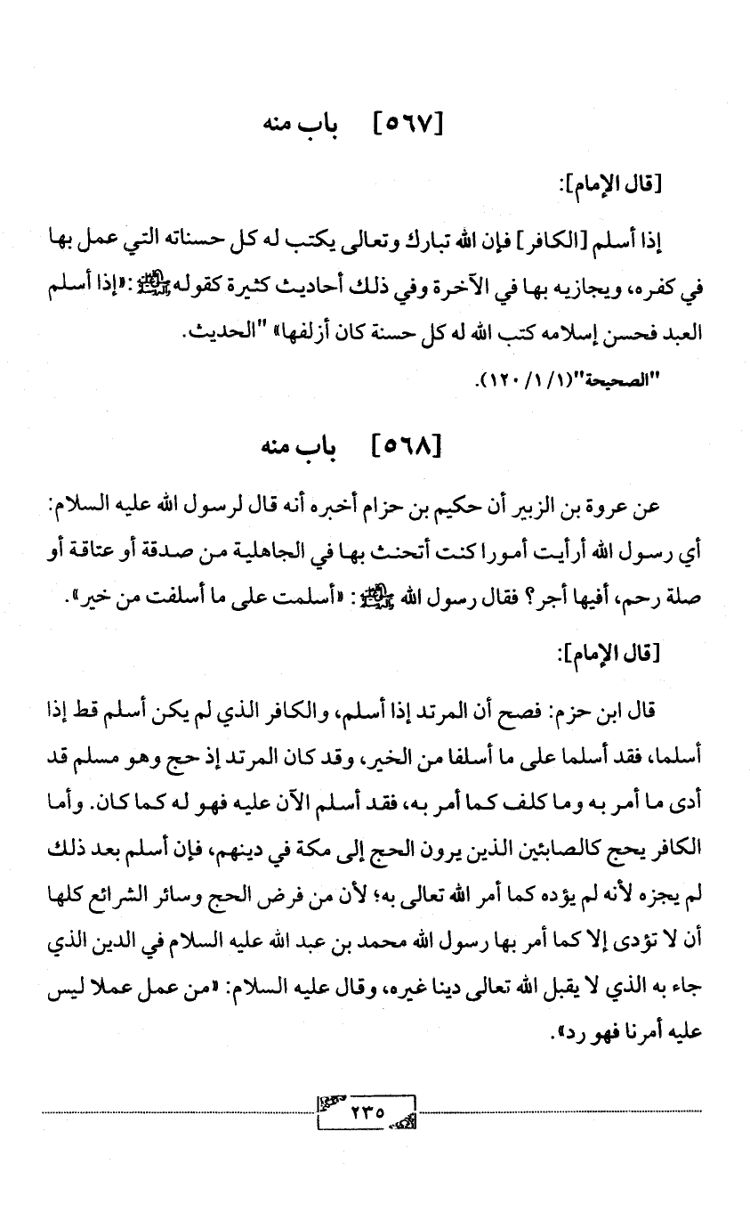 عن عروة بن الزبير أن حكيم بن حزام أخبره أنه قال لرسول الله عليه السلام: أي رسول الله أرأيت أمورا كنت أتحنث بها في الجاهلية من صدقة أو عتاقة أو صلة رحم، أفيها أجر؟ فقال رسول الله - صلى الله عليه وآله وسلم -: «أسلمت على ما أسلفت من خير».