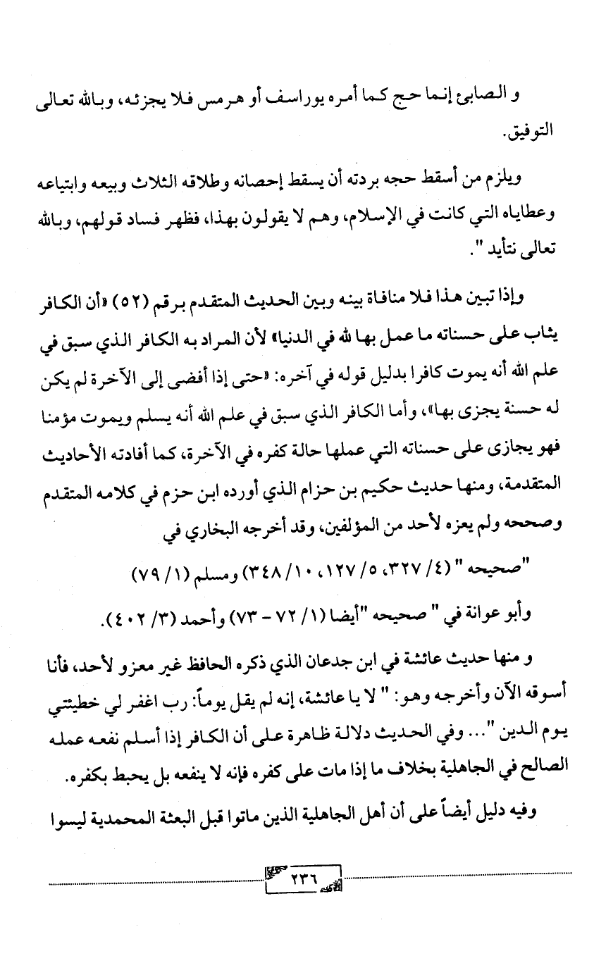 وإذا تبين هذا فلا منافاة بينه وبين الحديث المتقدم برقم (52) «أن الكافر يثاب على حسناته ما عمل بها لله في الدنيا» لأن المراد به الكافر الذي سبق في علم الله أنه يموت كافرا بدليل قوله في آخره: «حتى إذا أفضى إلى الآخرة لم يكن له حسنة يجزى بها»، وأما الكافر الذي سبق في علم الله أنه يسلم ويموت مؤمنا فهو يجازى على حسناته التي عملها حالة كفره في الآخرة، كما أفادته الأحاديث المتقدمة، ومنها حديث حكيم بن حزام الذي أورده ابن حزم في كلامه المتقدم وصححه ولم يعزه لأحد من المؤلفين، وقد أخرجه البخاري في