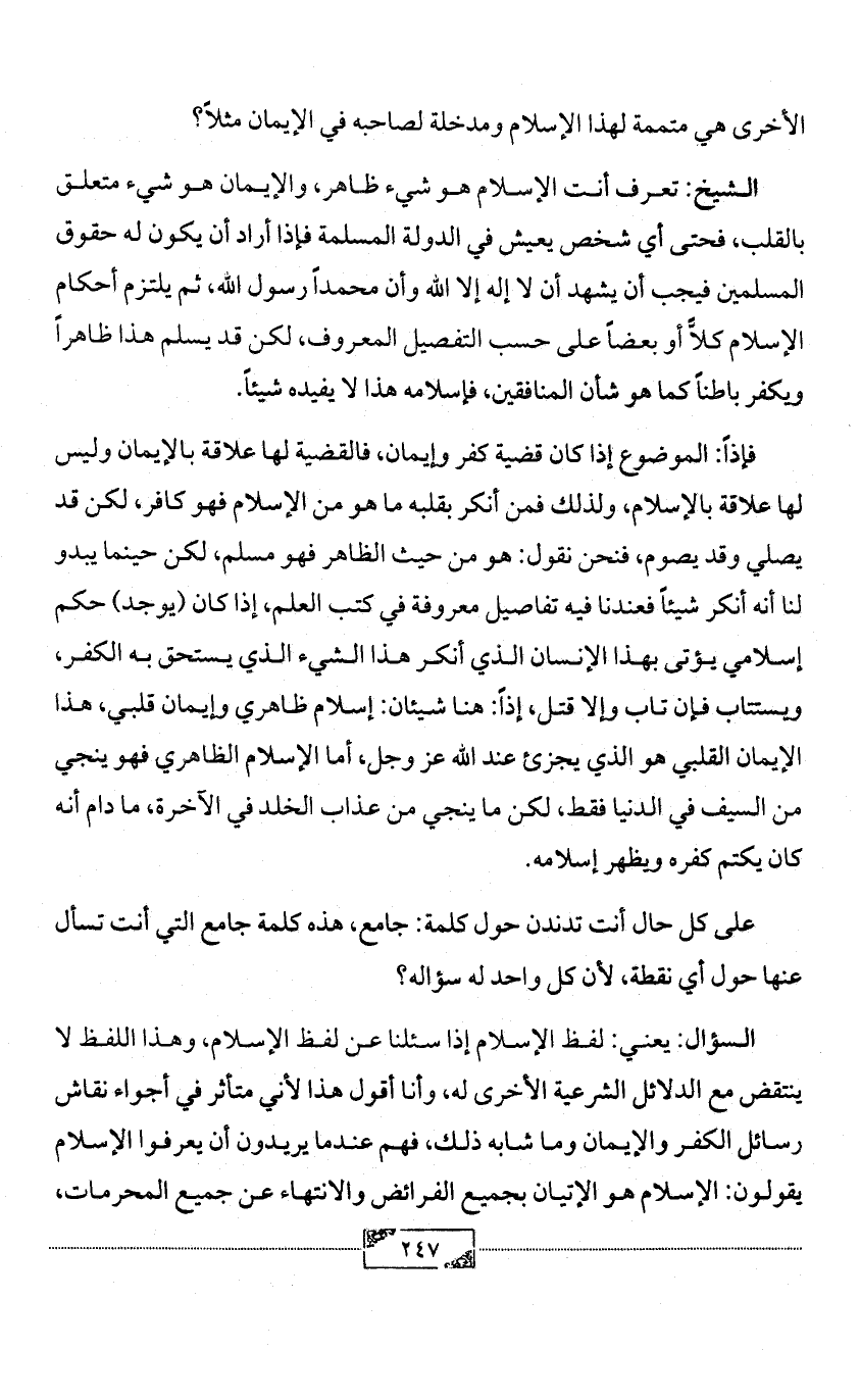 الشيخ: تعرف أنت الإسلام هو شيء ظاهر، والإيمان هو شيء متعلق بالقلب، فحتى أي شخص يعيش في الدولة المسلمة فإذا أراد أن يكون له حقوق المسلمين فيجب أن يشهد أن لا إله إلا الله وأن محمداً رسول الله، ثم يلتزم أحكام الإسلام كلاًّ أو بعضاً على حسب التفصيل المعروف، لكن قد يسلم هذا ظاهراً ويكفر باطناً كما هو شأن المنافقين، فإسلامه هذا لا يفيده شيئاً.