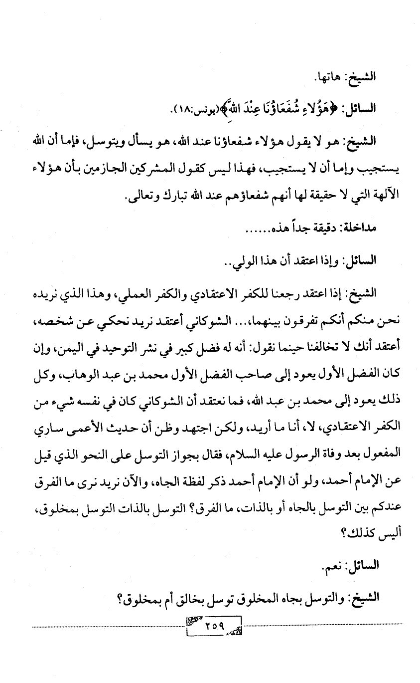 الشيخ: إذا اعتقد رجعنا للكفر الاعتقادي والكفر العملي، وهذا الذي نريده نحن منكم أنكم تفرقون بينهما، ... الشوكاني أعتقد نريد نحكي عن شخصه، أعتقد أنك لا تخالفنا حينما نقول: أنه له فضل كبير في نشر التوحيد في اليمن، وإن كان الفضل الأول يعود إلى صاحب الفضل الأول محمد بن عبد الوهاب، وكل ذلك يعود إلى محمد بن عبد الله، فما نعتقد أن الشوكاني كان في نفسه شيء من الكفر الاعتقادي، لا، أنا ما أريد، ولكن اجتهد وظن أن حديث الأعمى ساري المفعول بعد وفاة الرسول عليه السلام، فقال بجواز التوسل على النحو الذي قيل عن الإمام أحمد، ولو أن الإمام أحمد ذكر لفظة الجاه، والآن نريد نرى ما الفرق عندكم بين التوسل بالجاه أو بالذات، ما الفرق؟ التوسل بالذات التوسل بمخلوق، أليس كذلك؟
