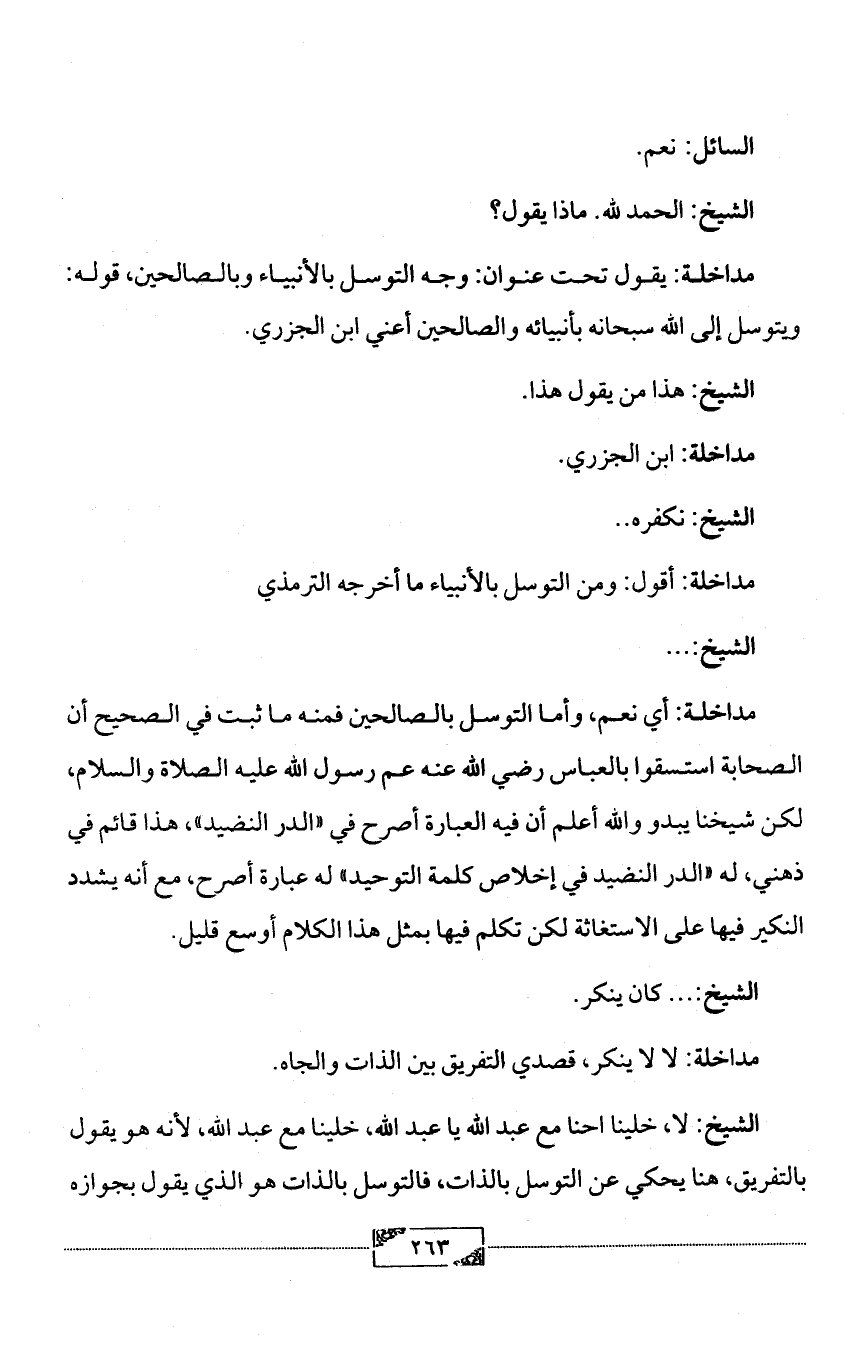 مداخلة: يقول تحت عنوان: وجه التوسل بالأنبياء وبالصالحين، قوله: ويتوسل إلى الله سبحانه بأنبيائه والصالحين أعني ابن الجزري.
