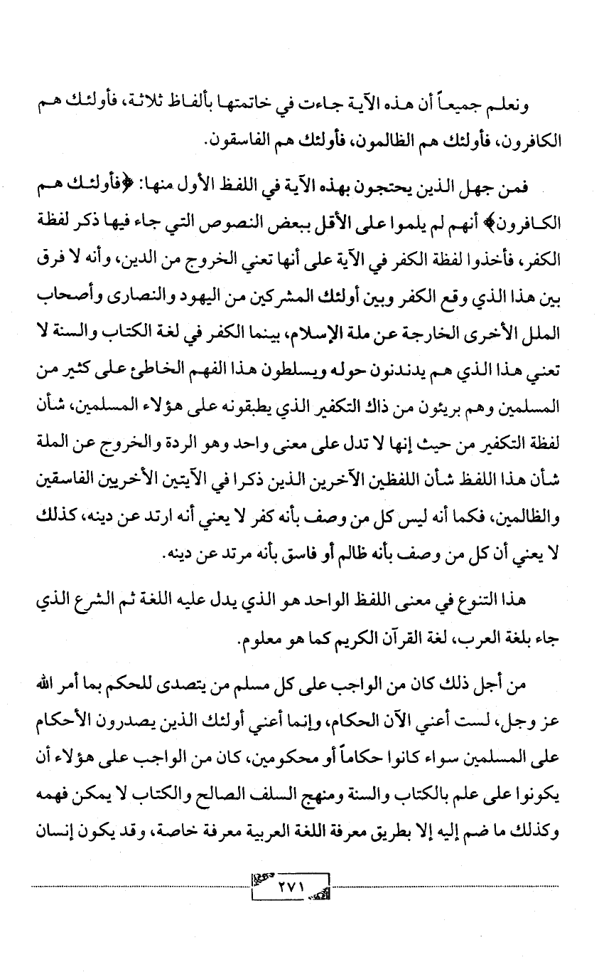 من أجل ذلك كان من الواجب على كل مسلم من يتصدى للحكم بما أمر الله عز وجل، لست أعني الآن الحكام، وإنما أعني أولئك الذين يصدرون الأحكام على المسلمين سواء كانوا حكاماً أو محكومين، كان من الواجب على هؤلاء أن يكونوا على علم بالكتاب والسنة ومنهج السلف الصالح والكتاب لا يمكن فهمه وكذلك ما ضم إليه إلا بطريق معرفة اللغة العربية معرفة خاصة، وقد يكون إنسان