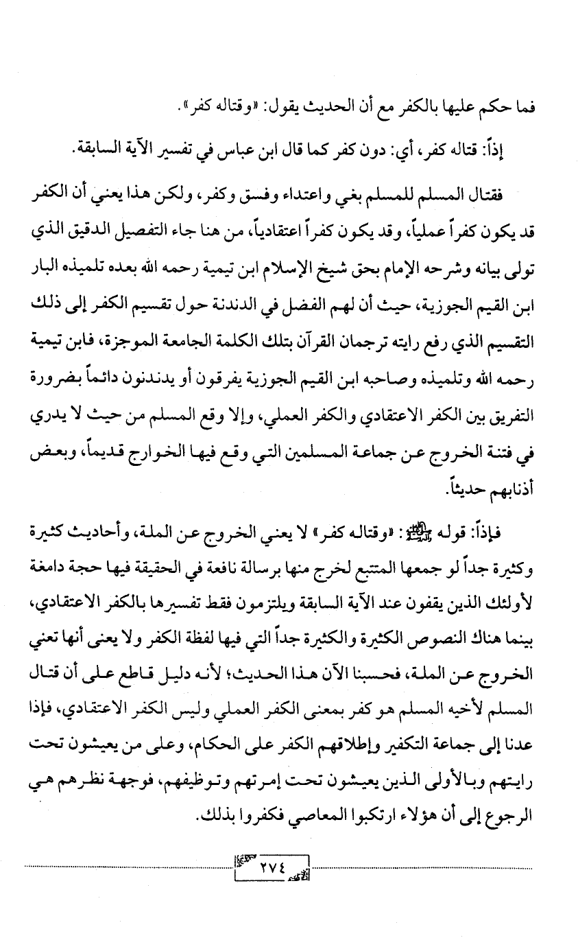 فقتال المسلم للمسلم بغي واعتداء وفسق وكفر، ولكن هذا يعني أن الكفر قد يكون كفراً عملياً، وقد يكون كفراً اعتقادياً، من هنا جاء التفصيل الدقيق الذي تولى بيانه وشرحه الإمام بحق شيخ الإسلام ابن تيمية رحمه الله بعده تلميذه البار ابن القيم الجوزية، حيث أن لهم الفضل في الدندنة حول تقسيم الكفر إلى ذلك التقسيم الذي رفع رايته ترجمان القرآن بتلك الكلمة الجامعة الموجزة، فابن تيمية رحمه الله وتلميذه وصاحبه ابن القيم الجوزية يفرقون أو يدندنون دائماً بضرورة التفريق بين الكفر الاعتقادي والكفر العملي، وإلا وقع المسلم من حيث لا يدري في فتنة الخروج عن جماعة المسلمين التي وقع فيها الخوارج قديماً، وبعض أذنابهم حديثاً.