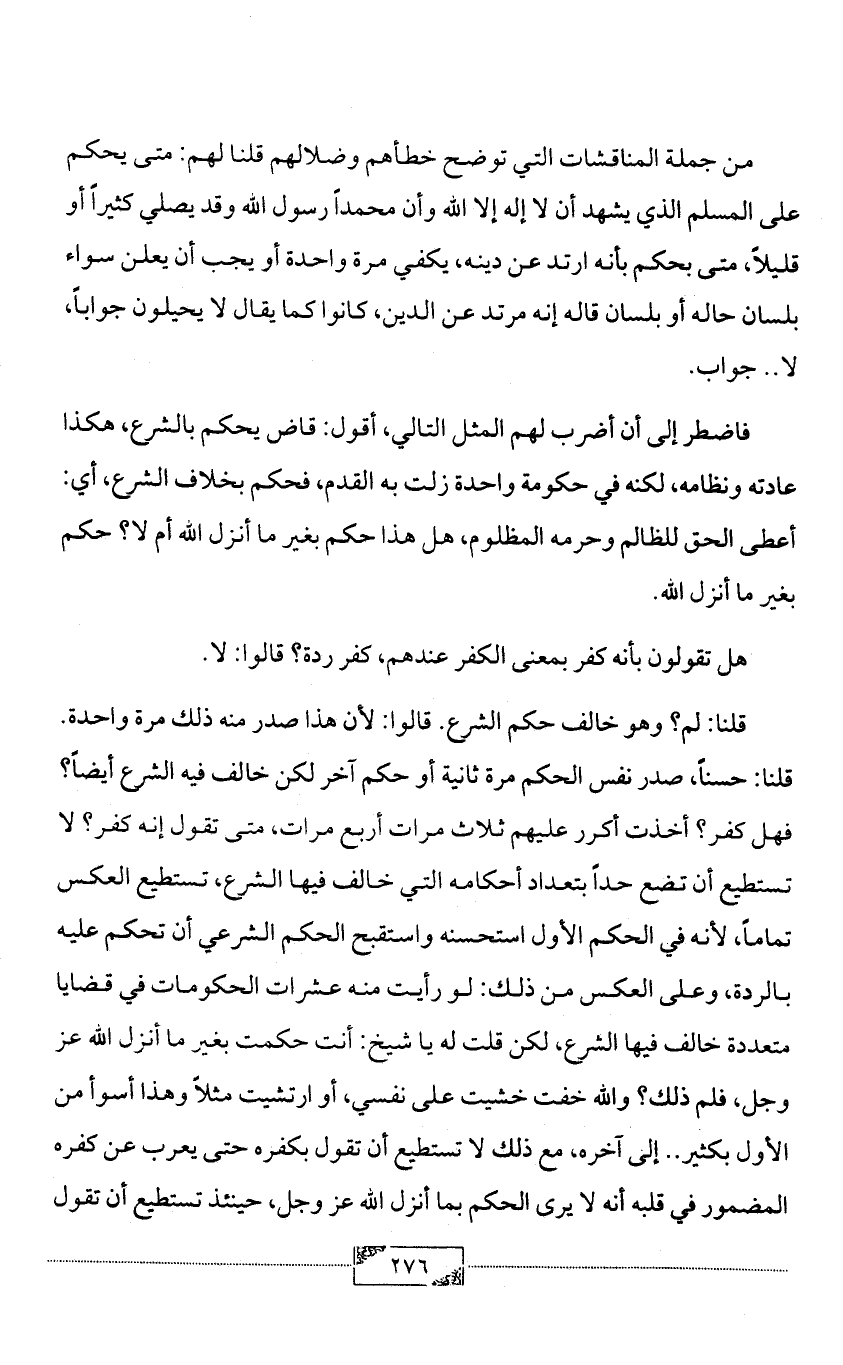 من جملة المناقشات التي توضح خطأهم وضلالهم قلنا لهم: متى يحكم على المسلم الذي يشهد أن لا إله إلا الله وأن محمداً رسول الله وقد يصلي كثيراً أو قليلاً، متى بحكم بأنه ارتد عن دينه، يكفي مرة واحدة أو يجب أن يعلن سواء بلسان حاله أو بلسان قاله إنه مرتد عن الدين، كانوا كما يقال لا يحيلون جواباً، لا .. جواب.