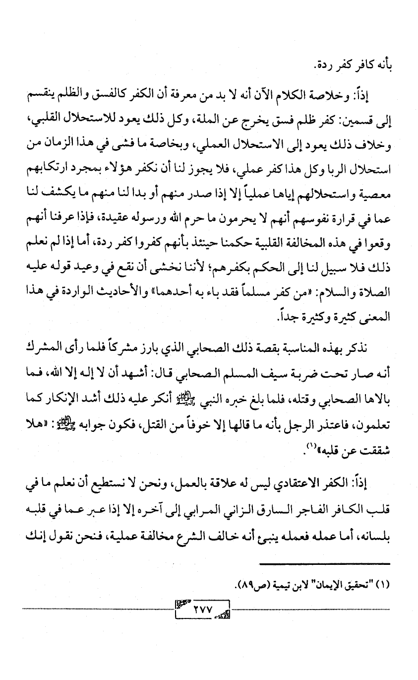 إذاً: وخلاصة الكلام الآن أنه لا بد من معرفة أن الكفر كالفسق والظلم ينقسم إلى قسمين: كفر ظلم فسق يخرج عن الملة، وكل ذلك يعود للاستحلال القلبي، وخلاف ذلك يعود إلى الاستحلال العملي، وبخاصة ما فشى في هذا الزمان من استحلال الربا وكل هذا كفر عملي، فلا يجوز لنا أن نكفر هؤلاء بمجرد ارتكابهم معصية واستحلالهم إياها عملياً إلا إذا صدر منهم أو بدا لنا منهم ما يكشف لنا عما في قرارة نفوسهم أنهم لا يحرمون ما حرم الله ورسوله عقيدة، فإذا عرفنا أنهم وقعوا في هذه المخالفة القلبية حكمنا حينئذ بأنهم كفروا كفر ردة، أما إذا لم نعلم ذلك فلا سبيل لنا إلى الحكم بكفرهم؛ لأننا نخشى أن نقع في وعيد قوله عليه الصلاة والسلام: «من كفر مسلماً فقد باء به أحدهما» والأحاديث الواردة في هذا المعنى كثيرة وكثيرة جداً.